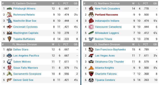 The Falcons were fifth in offense and ninth in runs allowed, while putting up mostly middling numbers in individual categories. It didn’t look like there was anything special to them. We had lost the season series in 2014, dropping to the Falcons 3-6. They had just lost LF/RF/1B Jorge Garcia (.267, 0 HR, 3 RBI) to a torn back muscle. The 34-year old should be out for most of the season. Projected matchups: Bill Conway (1-1, 3.38 ERA) vs. Jorge Silva (0-3, 5.87 ERA) Daniel Dickerson (0-3, 5.52 ERA) vs. John Key (0-0, 4.26 ERA) Nick Brown (1-2, 6.39 ERA) vs. Steve Kreider (3-1, 1.97 ERA) The Falcons will send three right-handers against us. We will shove Dickerson throughout the rotation in the next week-plus to take a start from him. The Raccoons will have the next three Thursdays off. It doesn’t work out for this week, yet. Game 1 POR: CF Carmona – 2B Sambrano – LF Richards – 1B Murphy – 3B Nunley – RF Reya – SS Taylor – C Margolis – P Conway CHA: 2B Wagner – 3B Best – RF Nieves – 1B Myers – SS P. Hall – CF Pearcy – C Case – LF Monreal – P J. Silva Former Raccoons farmhand Ralph Myers put the Falcons atop quickly with a 2-out double in the bottom of the first inning. Conway had walked Steve Best and had advanced him on a wild pitch, hinting early at his potential for terrible control. He did not get better even one bit. By the fourth, he had zero strikeouts, but another run had already scored after a walk with nobody out. Conway had Silva at the plate with two outs and two runners on first and second in the fourth inning. Conway threw a wild pitch, then conceded a 2-run single to the pitcher to put himself into a 4-0 hole. Two runs were stranded in scoring position by the Falcons in the fifth. Ralph Myers had reached on a fielder’s choice, Paul Hall had doubled, but then Erik Pearcy popped out to Reya in shallow right and Aaron Case grounded a pitch to first base for Stan Murphy to end it. The Coons’ offense had yet to be mentioned, but was frankly completely AWOL. They had a man in scoring position once early, then again when Sandy Sambrano made it to second on an errant pickoff throw, that with nobody out although he never reached third base, and when Jason Seeley batted for Conway with two outs and Taylor on first base in the top of the seventh and launched a liner into the gap in left center, Mario Monreal appeared out of nowhere and robbed him. The Raccoons were so harmless, Silva breezed through the game for a 7-hit shutout, finishing them up in under 2:30. 4-0 Falcons. Sambrano 2-4; Margolis 2-3, 2B; Entwistle 1.2 IP, 1 H, 0 R, 0 BB, 3 K; The Crusaders are now the only team over .500 in the North. Palmer Taylor, batting .182, was returned to St. Petersburg after the game as we activated Ronnie McKnight off the DL. Also, D-Alex claimed he was good to go. Ivan the Druid had his doubts, but I think D-Alex definitely wanted to get out of the Druid’s treatment, which consisted of D-Alex being beaten with a wet towel for half an hour, twice daily. Game 2 POR: CF Carmona – 2B Sambrano – LF Richards – 1B Murphy – 3B Nunley – RF Bednarski – C Alexander – SS McKnight – P Dickerson CHA: 2B Wagner – CF Huibregtse – C Holliman – SS P. Hall – 3B Best – RF Puckett – 1B Griffin – LF Pearcy – P Key Fueled by Ryan Holliman’s RBI triple, the Falcons put up two runs off the pale Dickerson right in the first inning. Randy Wagner had hit a leadoff single, and Paul Hall plated Holliman with a groundout to short. The Coons made up the deficit in the third inning. After McKnight hit a triple that made Steve Huibregtse in centerfield real bad, Dickerson made himself useful and singled to left to plate him. Cookie grounded up the middle, getting Dickerson forced, but then stole second and took third on Holliman’s errant throw. Sandy then doubled through Steve Best on a real hard shot (not really Best’s fault, human reaction times have a certain limit), chasing home Cookie with the tying run. Key had Ron Richards in a full count with two outs and the two battled until Richards swung over a low fastball. Dickerson, while moderately useful at the plate, was of no greater benefit to have on the mound than a block of wet soap, and surrendered back-to-back doubles to Huibregtse and Holliman in the bottom of the same inning, setting the Falcons ahead 3-2 again. Other than that, the Raccoons remained somewhere between embarrassing and pathetic. They hit into double plays in the fifth and seventh innings, the latter after Matt Nunley’s drive to deep right was caught by Chris Puckett, with Murphy on first base and no outs. Dickerson made it into the seventh inning, logging one more out before Myers had a pinch-hit double and knocked him out. Ron Thrasher killed off that insurance run at second base, and then the Falcons were in their pen, too, in the top 8th and the Coons threw out the contents of their bench and see whether something might stick. Indeed, it did, as Jason Bergquist had an infield single hitting for McKnight against southpaw Mauro Ortega, and Luis Reya walked against righty Roberto Ramirez, bringing up the top of the order with the tying and go-ahead runs on and one out. Ramirez also lost Cookie on a walk, loading the bases, at which point Walt Canning was brought in to run for Reya as the go-ahead run on second base. That move turned out to be unnecessary (but Canning would have taken over at short anyway), as Sandy struck out, but Ron Richards beat Puckett with a double that dinked just in front of the wall and emptied the bases for three runs! Murphy fouled out to end the inning. Up 5-3, the first thing the Coons’ pen could think of was to load the bases and have nobody out while doing that. Entwistle allowed singles to both Holliman and Hall, and when Sugano replaced him for the three following left-handed bats, he walked Steve Best. Puckett scored one run with a groundout before Daron Griffin popped up. With right