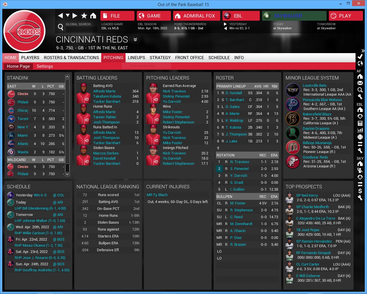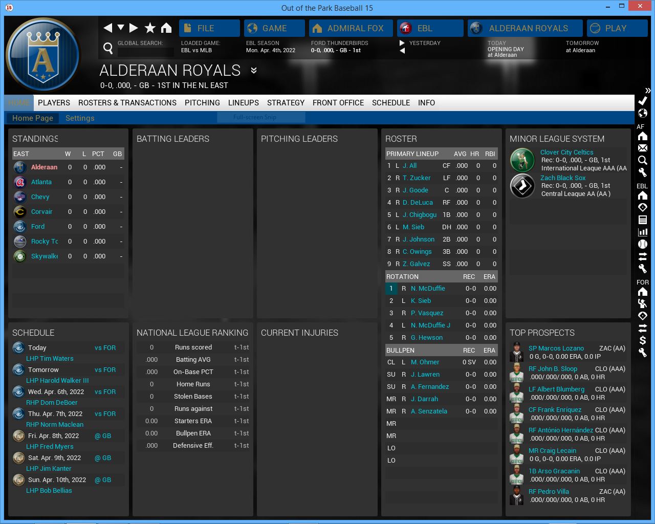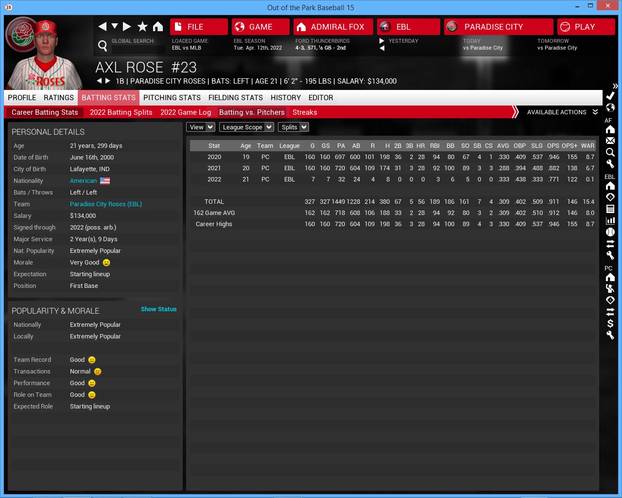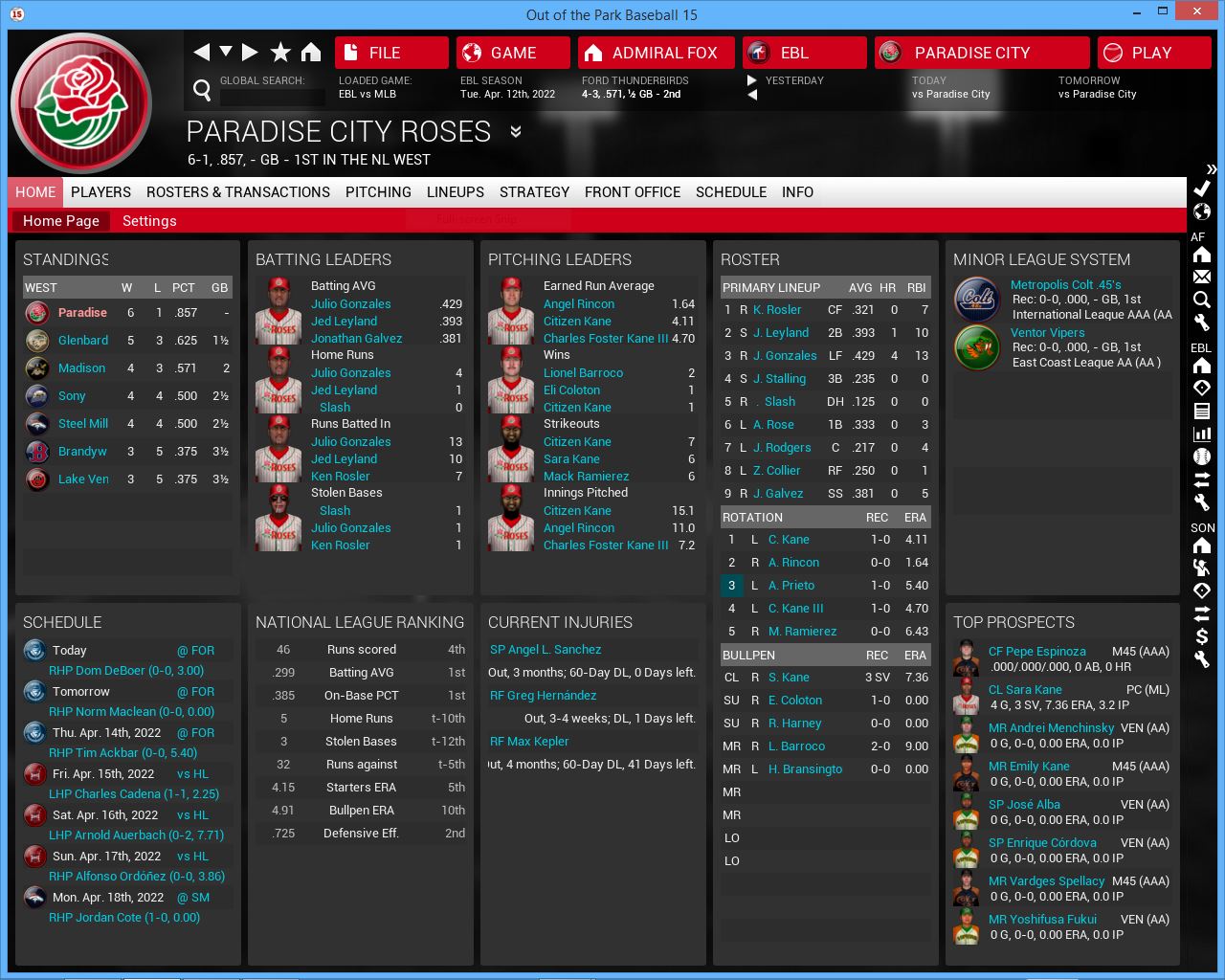 3 games vs Roses. Home opener. Hopefully playing at home will get us back on track but this series will be tough vs the NL West leading Roses. Their young players are getting better and better. They added 3B John stalling to their starting lineup (rookie year was supposed to be 2020 but somehow I missed him, he is not a rookie), Axl Rose & Julio Gonzalez look better. Charles Foster Kane III is finally in their rotation. They will be a tough team to play all season.