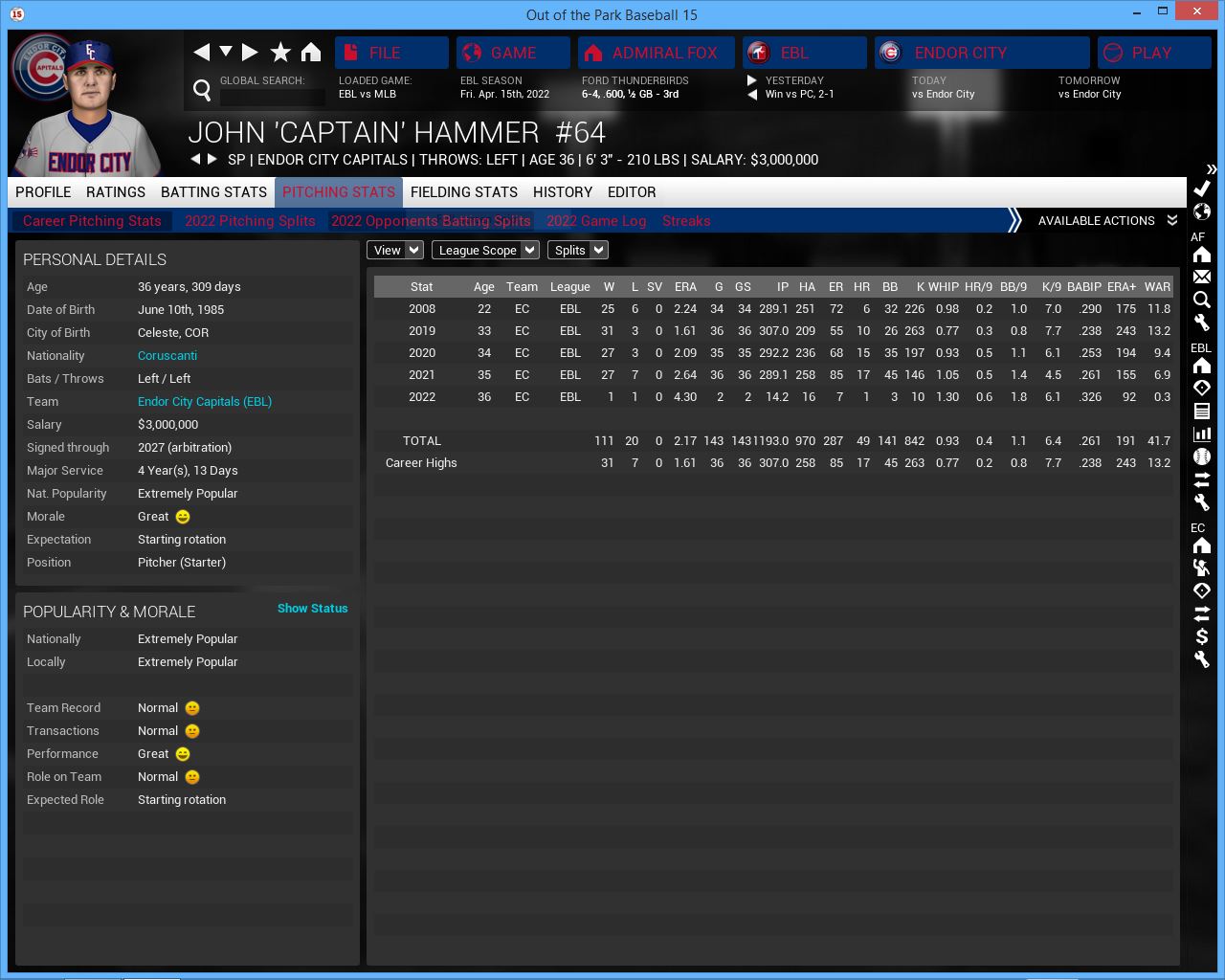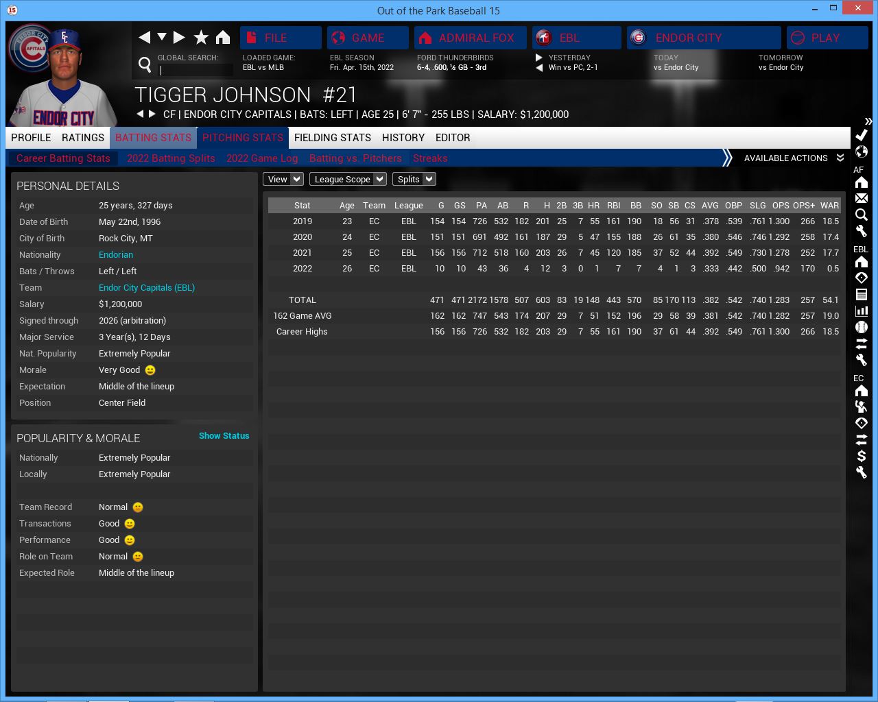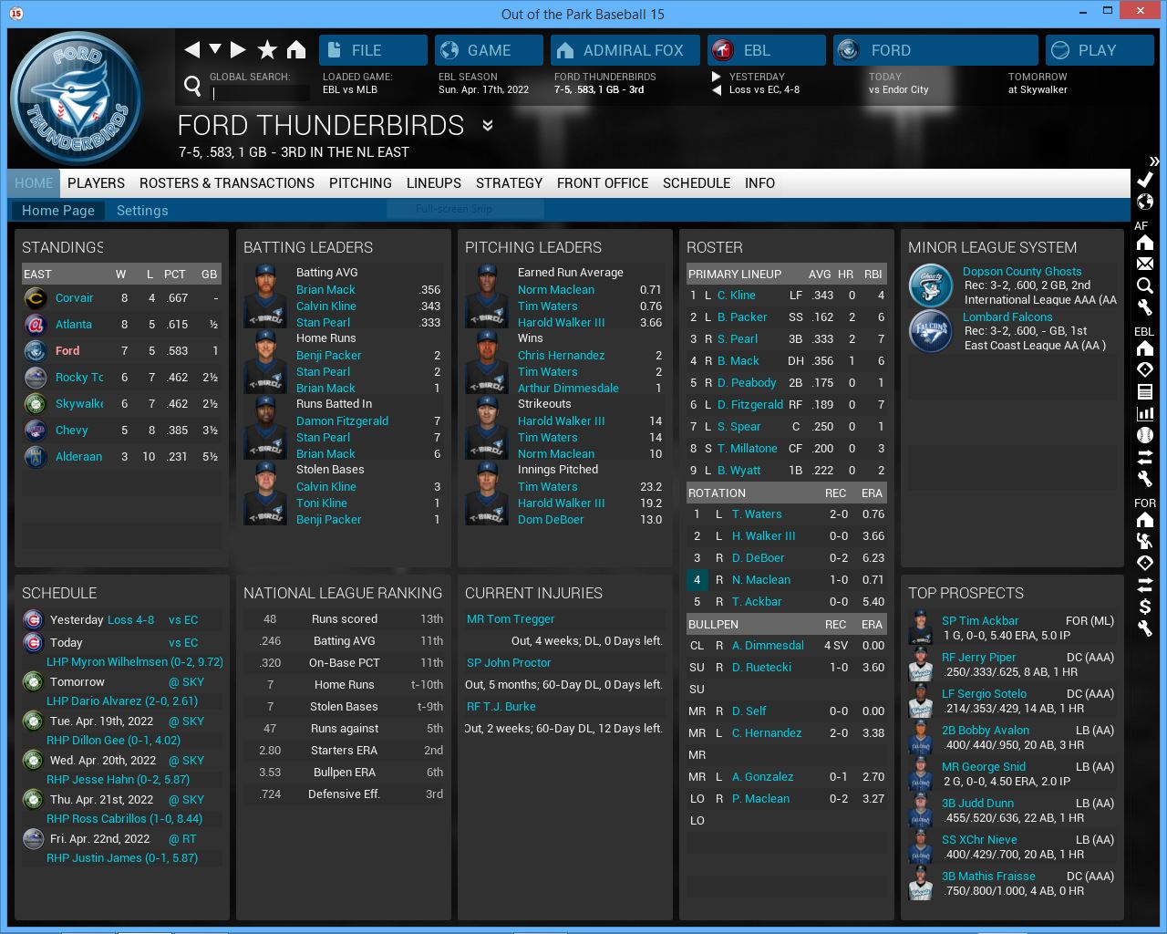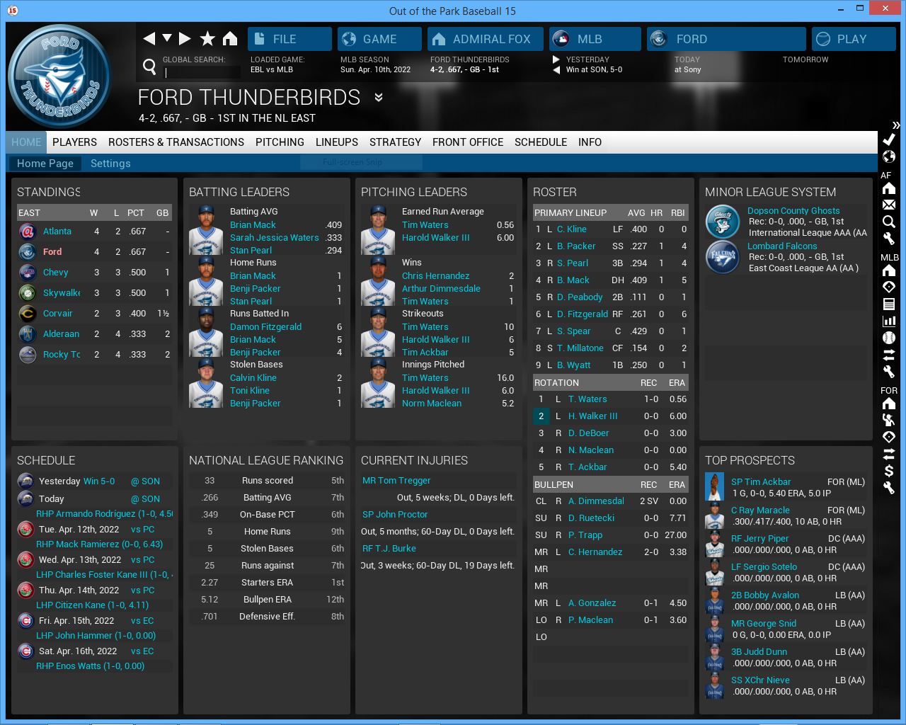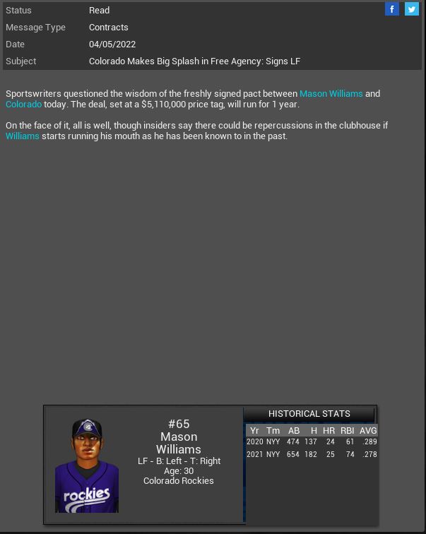 3 games vs Roses. Home opener. Hopefully playing at home will get us back on track but this series will be tough vs the NL West leading Roses. Their young players are getting better and better. They added 3B John stalling to their starting lineup (rookie year was supposed to be 2020 but somehow I missed him, he is not a rookie), Axl Rose & Julio Gonzalez look better. Charles Foster Kane III is finally in their rotation. They will be a tough team to play all season.