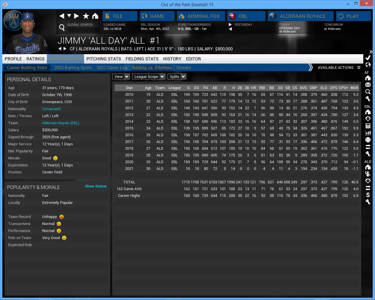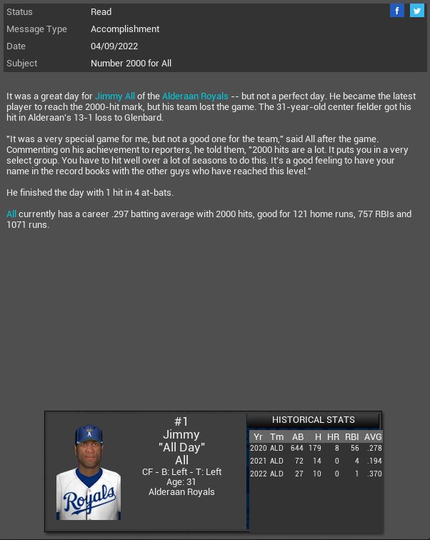 A look at Jimmy All's career. His 2000 Hits rank 20th all time. 561 SB ranks 4th. Gotham City loses SP Rich Dale til next season. Organa Royals MR Brian Rauh will spend 4-5 months on the DL.