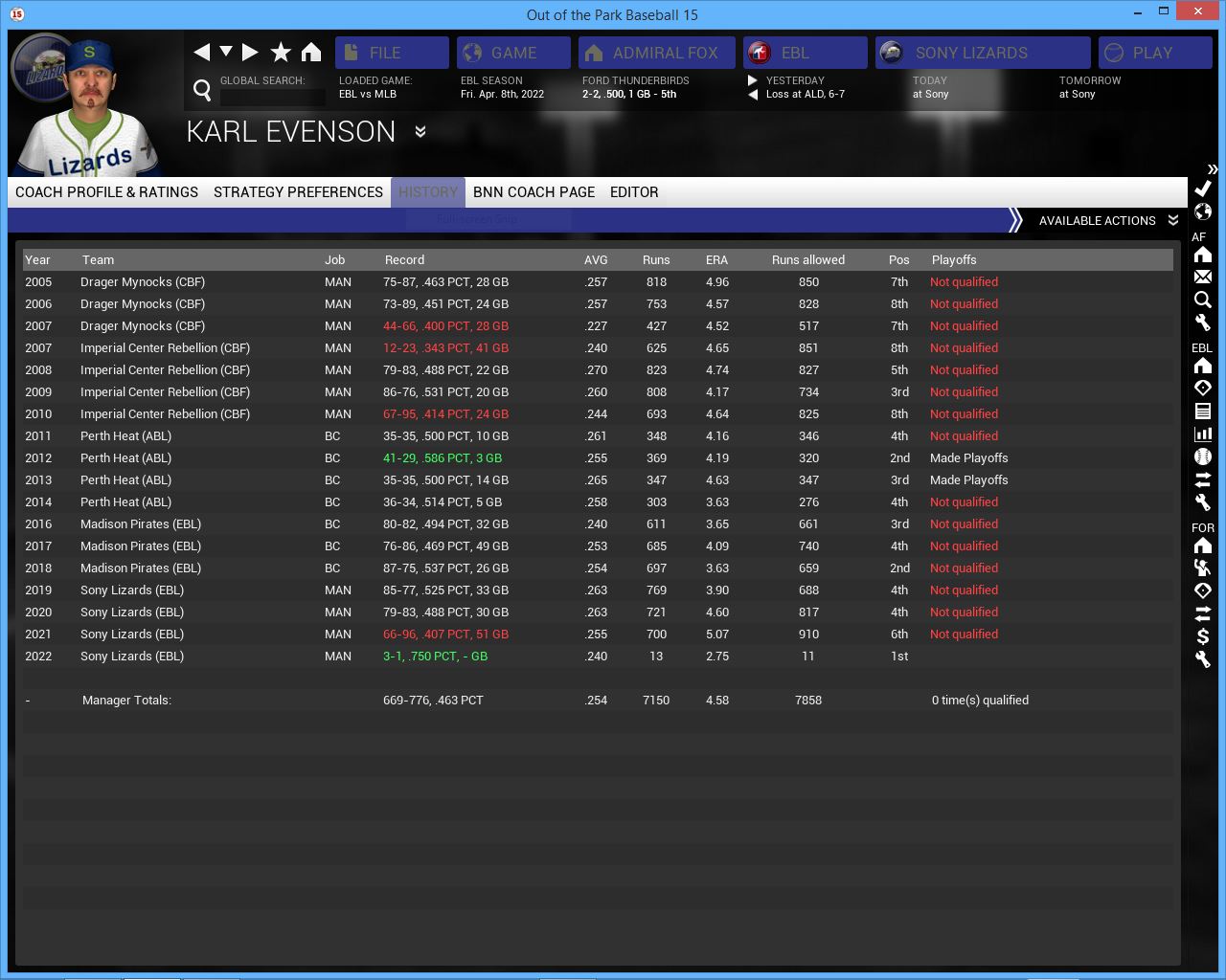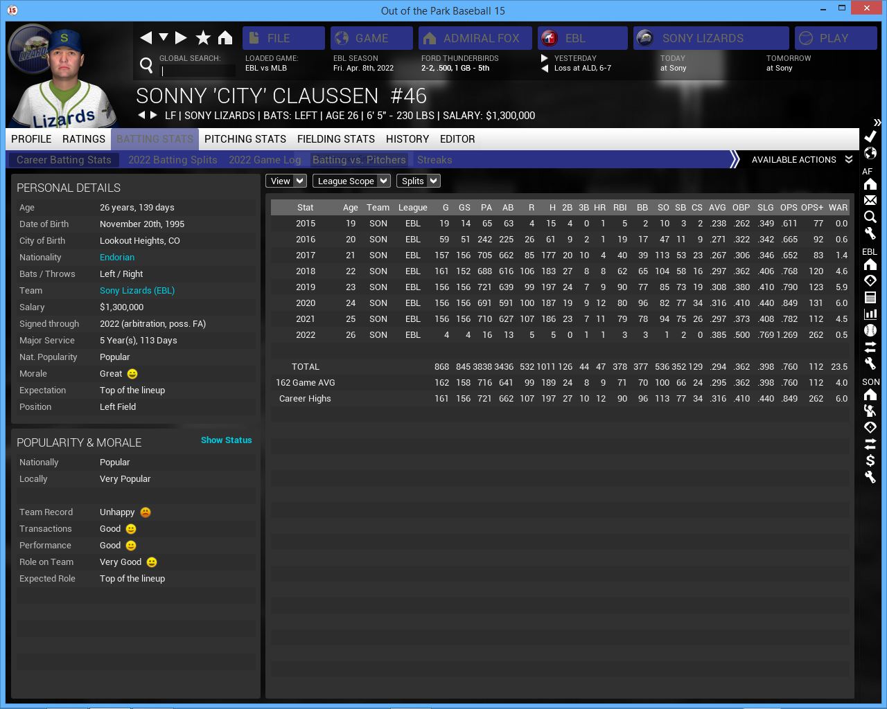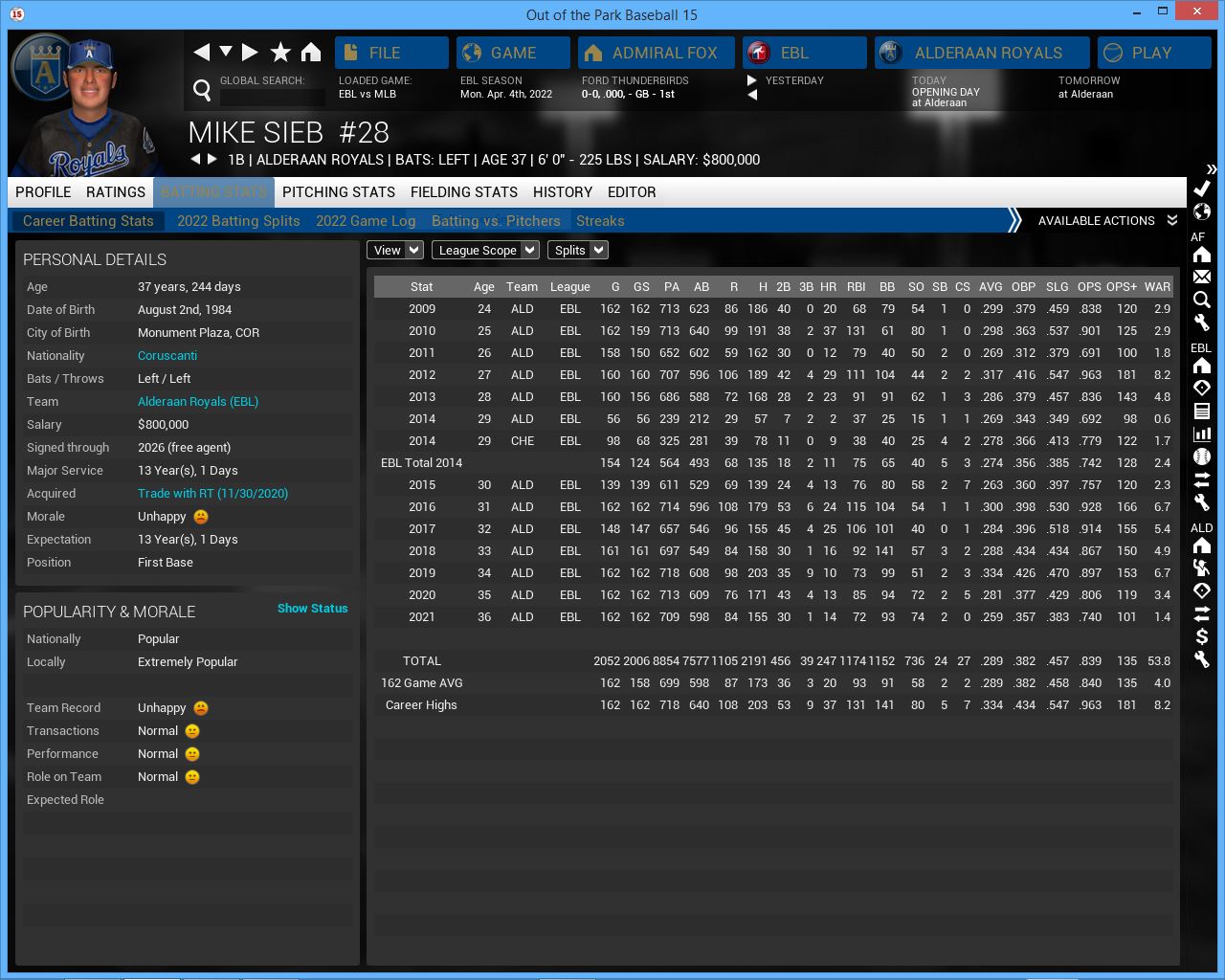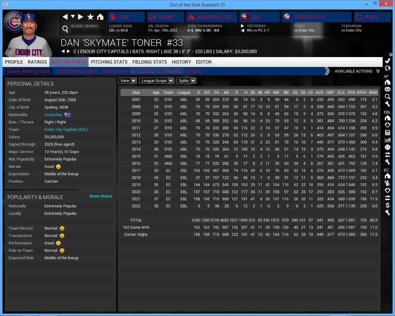 2022 Season opener. The Royals for now look good. Having Cf Jimmy All back from injury changes the way this lineup plays. He gives them good speed at the top of the lineup. They are led by 1B/DH/MGR Mike Sieb. They are a decent hitting team but lacked power last year. Don deLuca needs to step up this year. They have a little bit more OF depth this year with LF Johnny A. Bates but he doesn't look like the hitter he was 3 yrs ago. They have 4 solid SP that can give them 190 + innings and a strong pen but not a great CL.