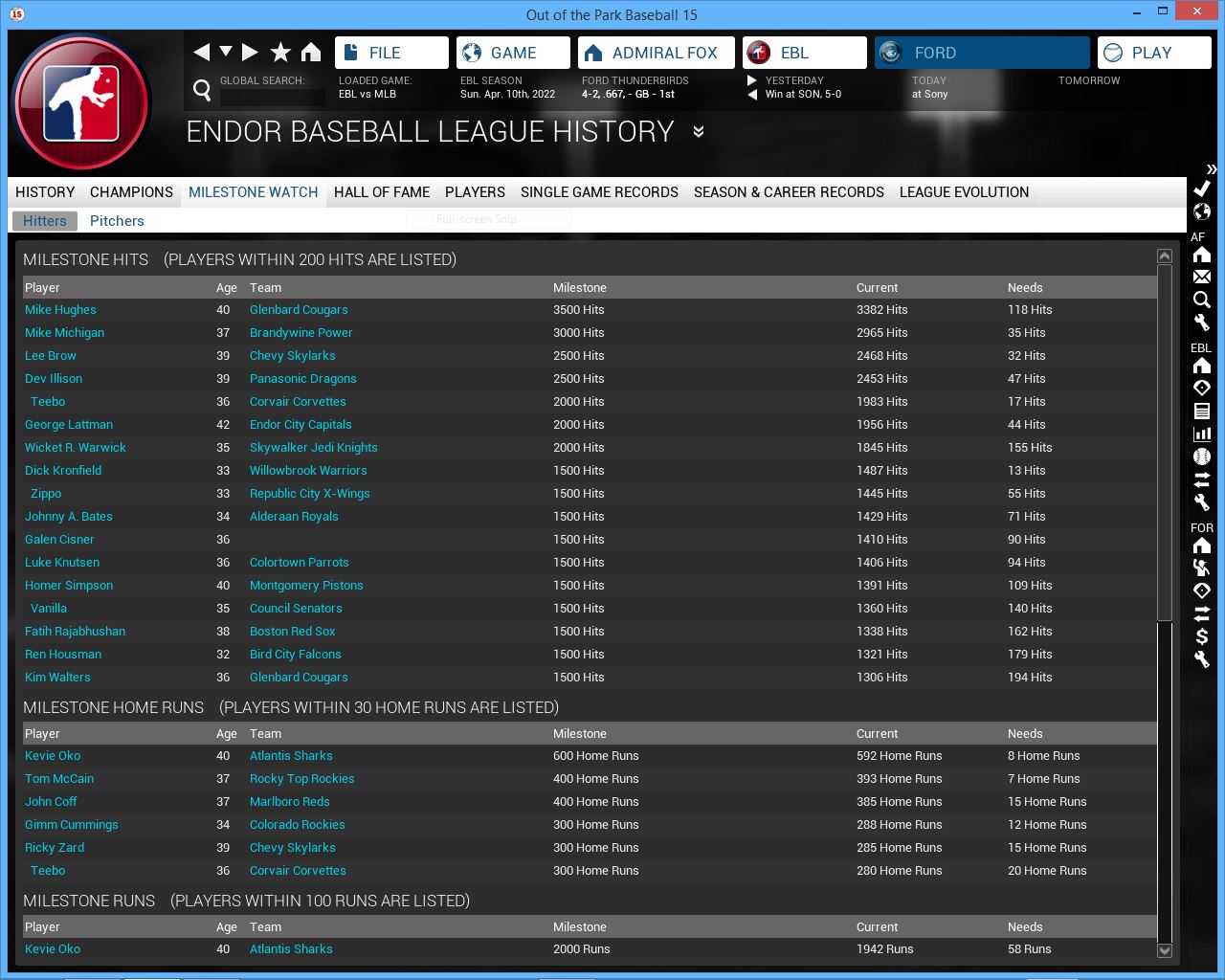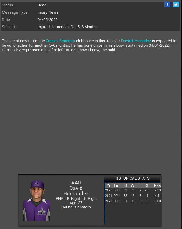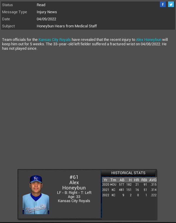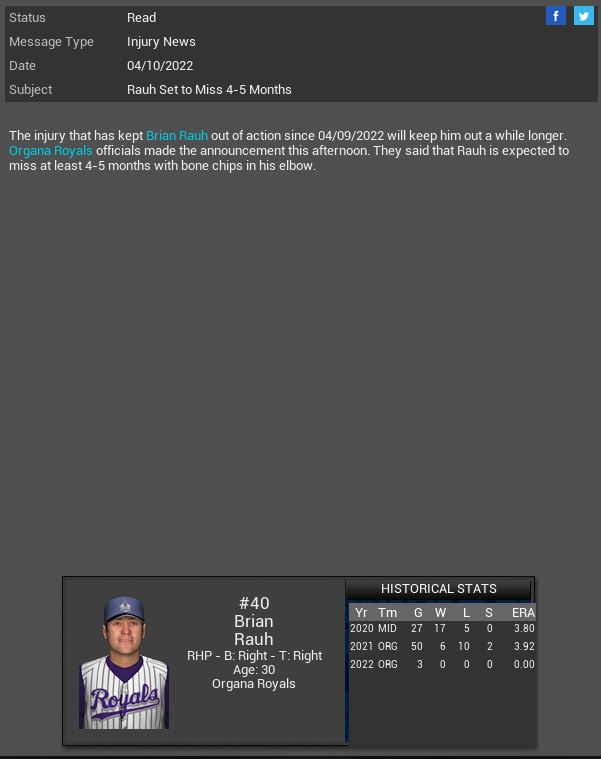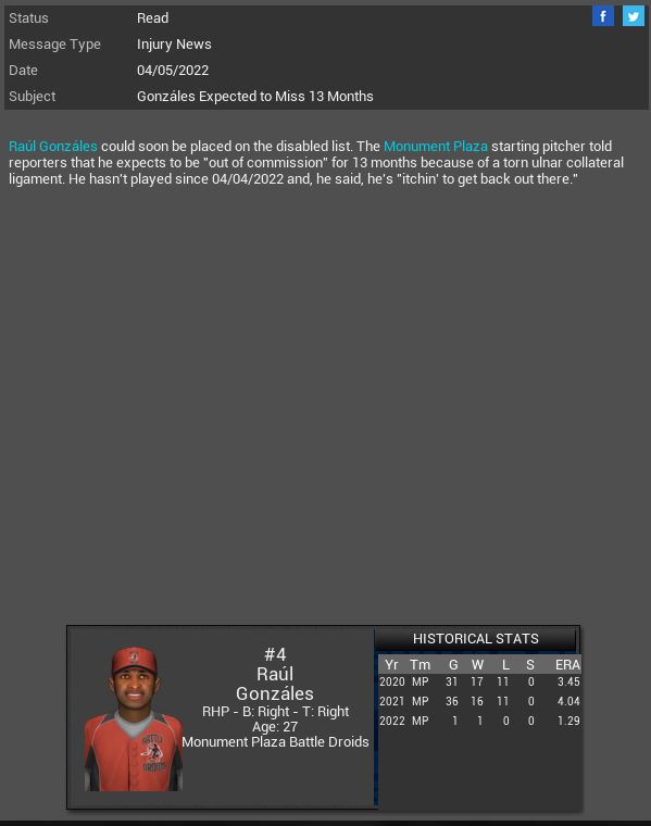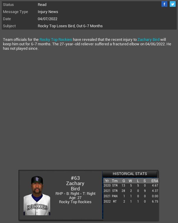 Rocky Top Rockies MR Zachary Bird will spend 6-7 months on the DL. Organa Royals LF Shoeless Joe Jackson will miss 6 weeks. Monument Plaza Battle Droids signed CF Brian Jensen. Kansas City SP Jose R. Fidler gets a CG SH vs Oakland giving up 1 Hit. Royals also lose LF Alex Honeybun for 5 weeks.
