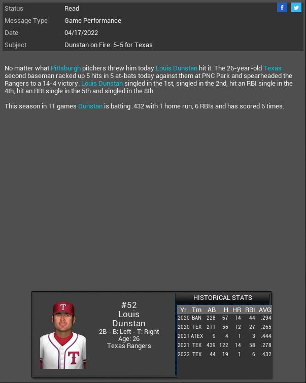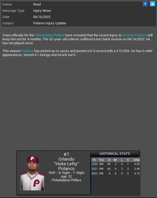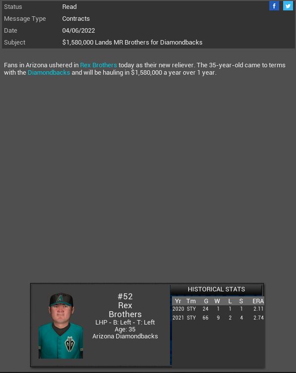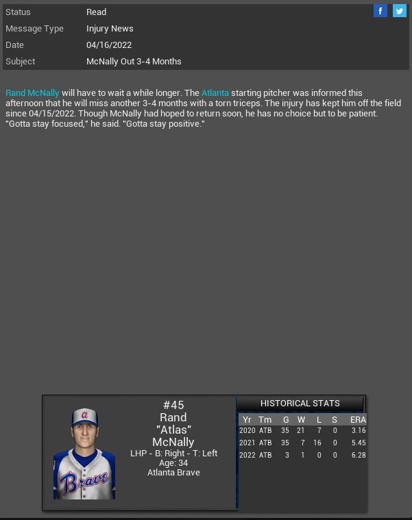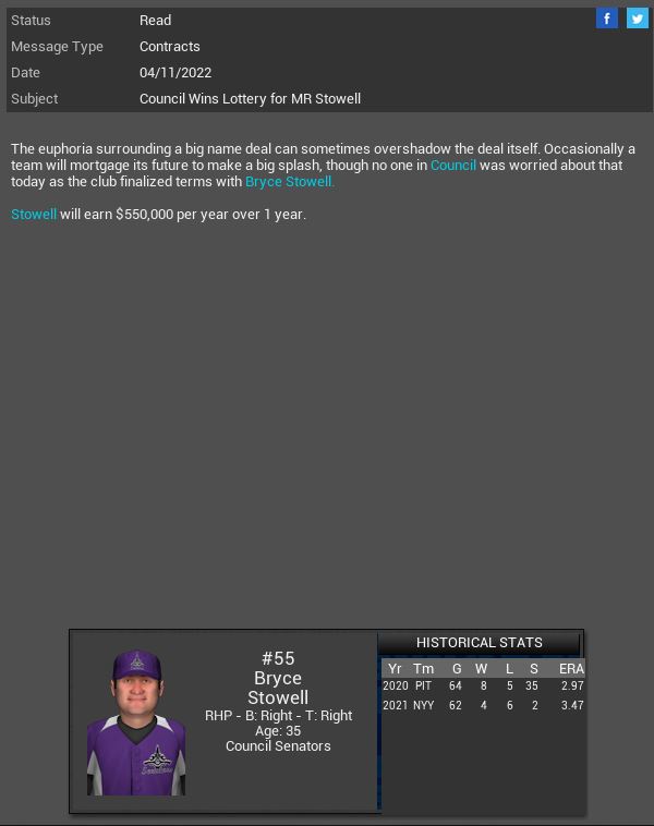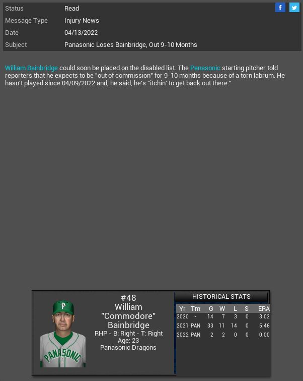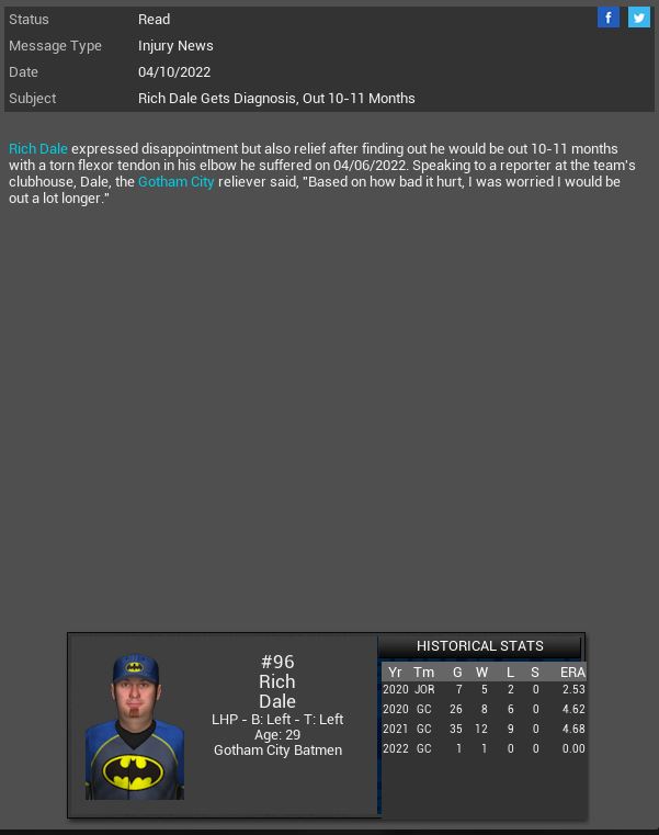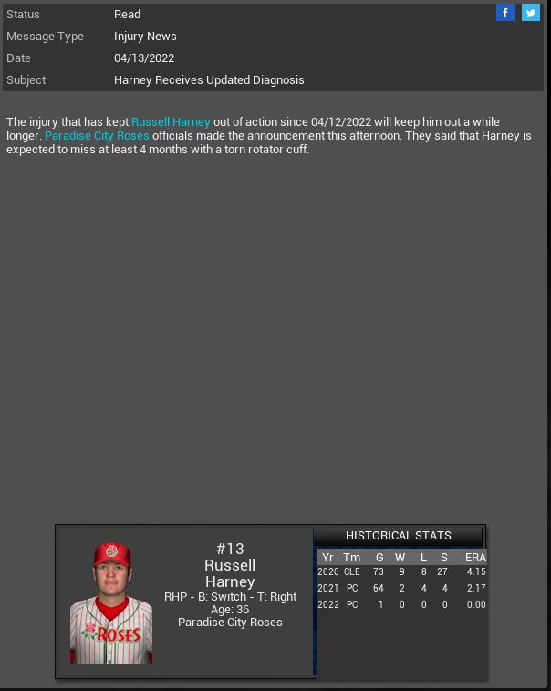 Arizona Diamondbacks signed MR Rex Brothers. Willowbrook Warriors CL B.B Eggleston will miss 11 months due to her being pregnant. This will be her 1st child. Corvair Corvettes SP James Jamieson gets a CH SH vs Madison with 6 K. Hyperspace' Vance Worley dominated the X-Wings striking out 10 batters. Boston Red Sox MR Willie Simpson will spend 4 months on the DL.