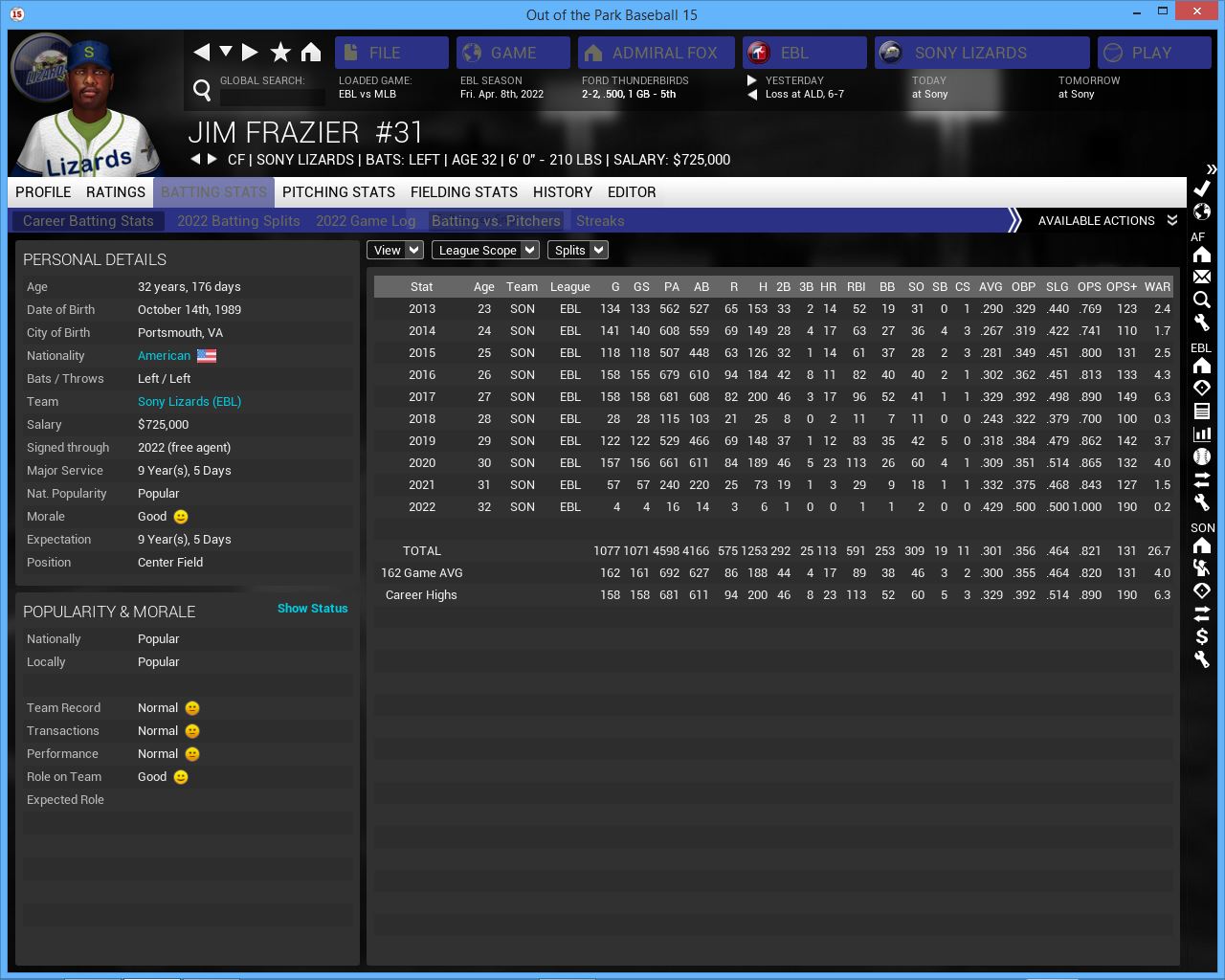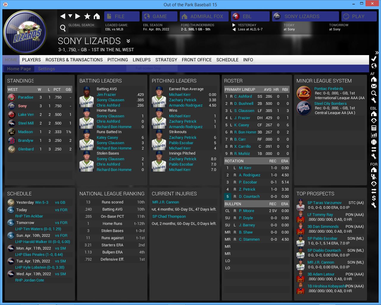 3 games at the new look Lizards. They look a little bit better then last year and so far are 3-1 tied for the lead in the AL West. They have 2 impressive rookies in Katey Casey, the daughter of John Casey and SP Diablo Countach who reminds some of a young John Smoltz. They like to run a lot. Sonny Claussen is perhaps their best player although aging CF/DH Jim Frazier would be a close 2nd. I am not sold on their pitching staff. Their starters last year combined for 15 Wins between 3 starters. They also have another rookie SP in Pablo Escobar who won 5 games at AAA last year. Their pen is above average.