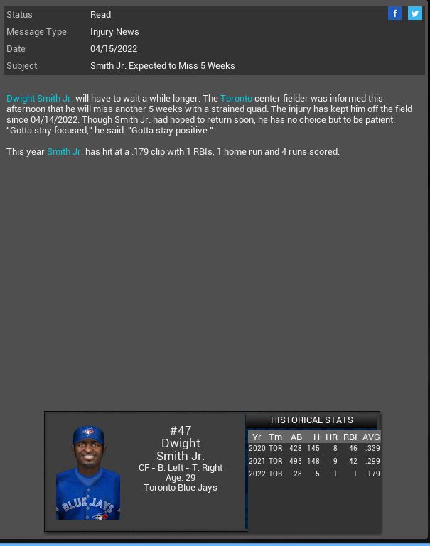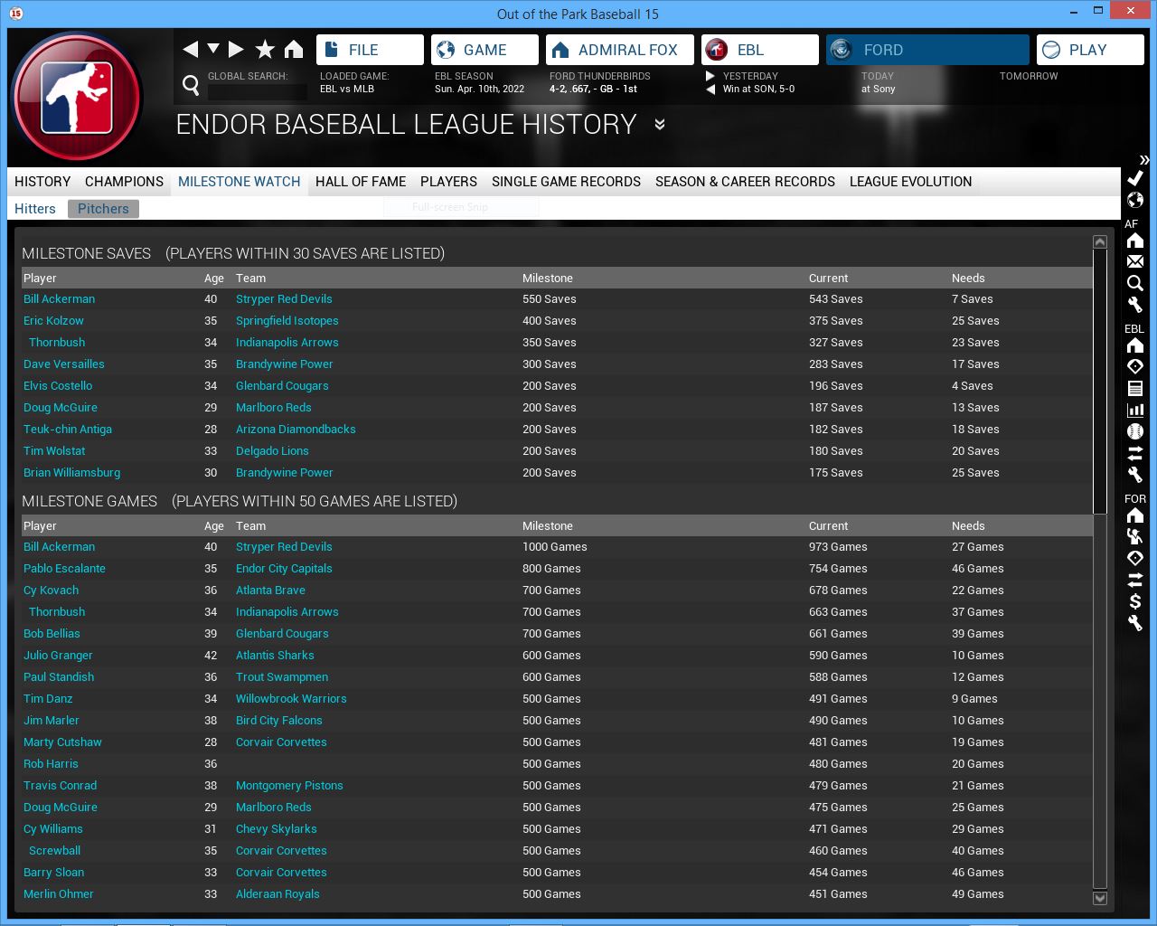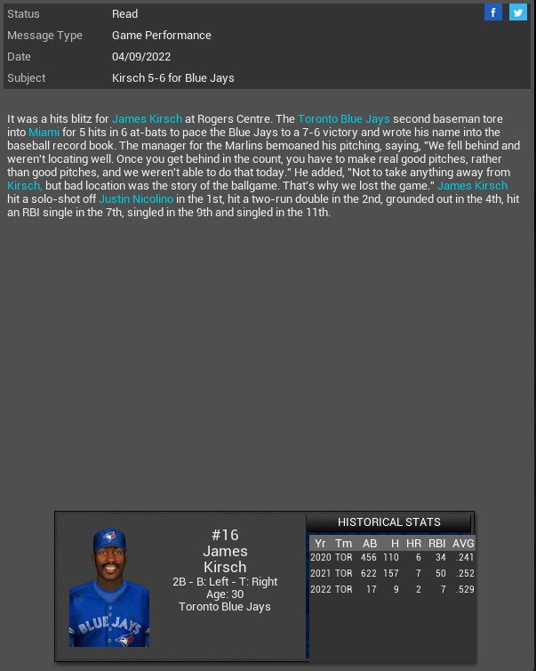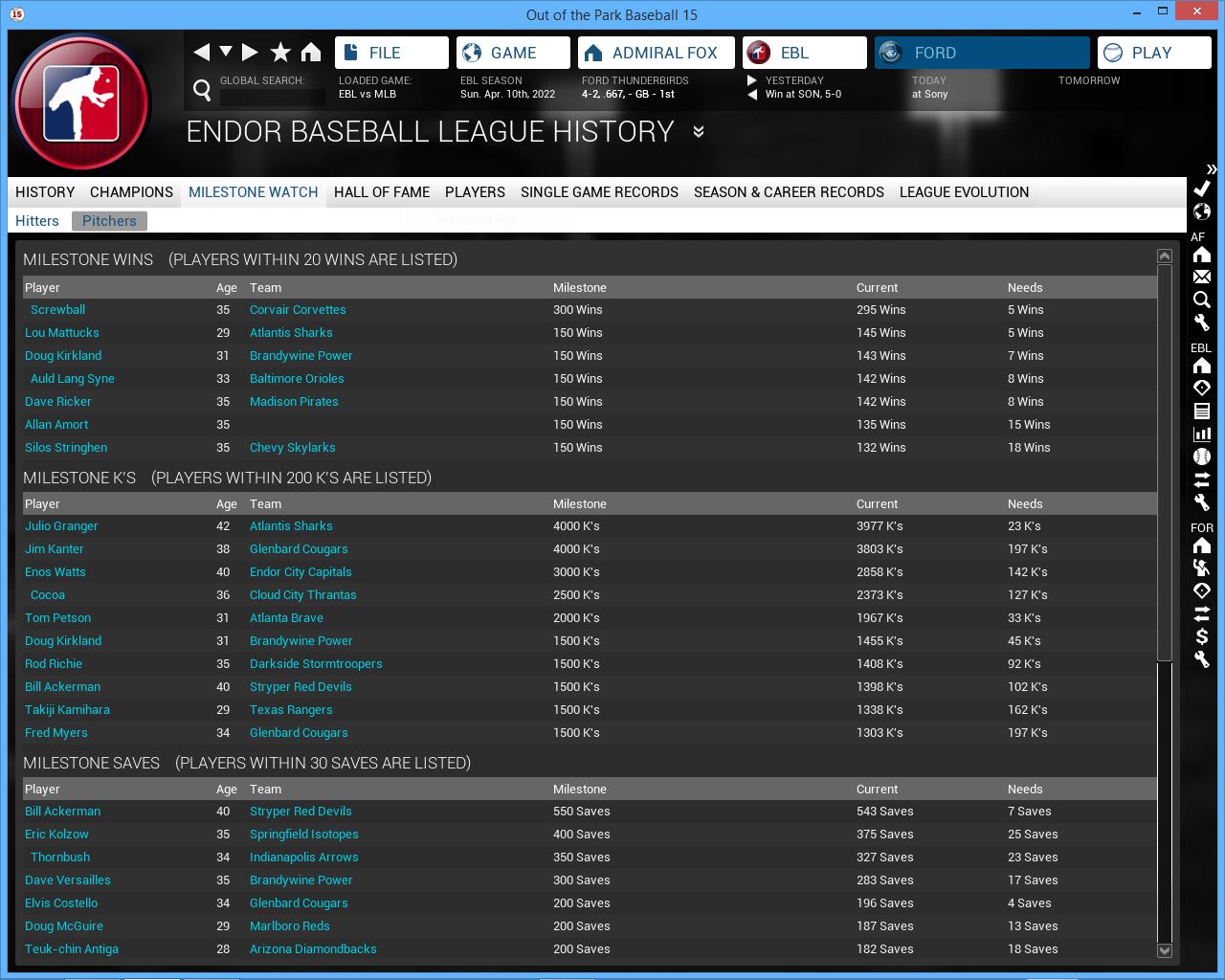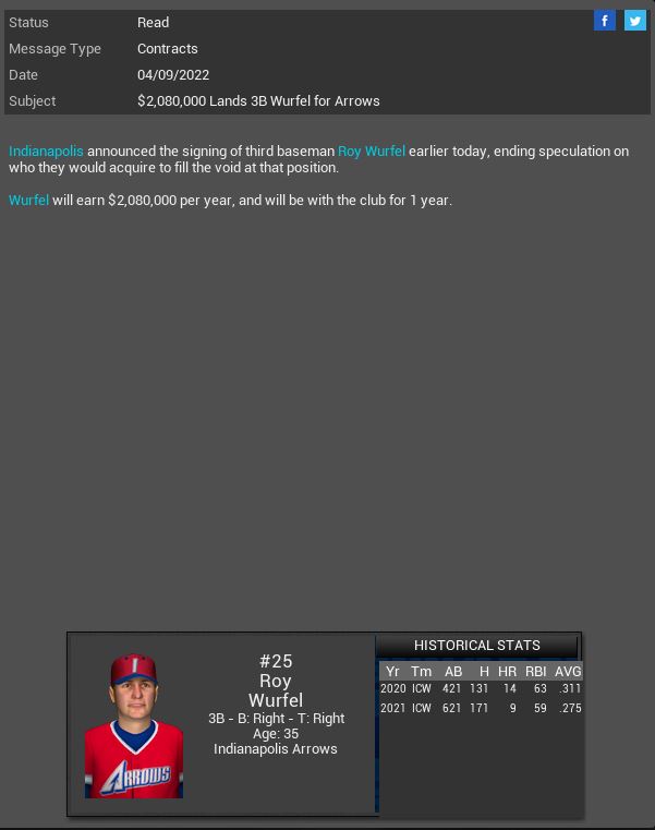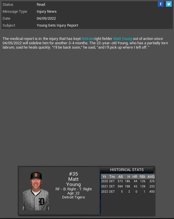 Detroit Tigers RF Matt Young will miss 3-4 months. Indianapolis Arrows sign 3B Roy Wurfel. Tim Waters gets a CG SH vs Sony. Toronto Blue Jays 2B James Kirsch has a 5 hit game. Alderaan Royals CF Jimmy All gets his 2000th Hit.
