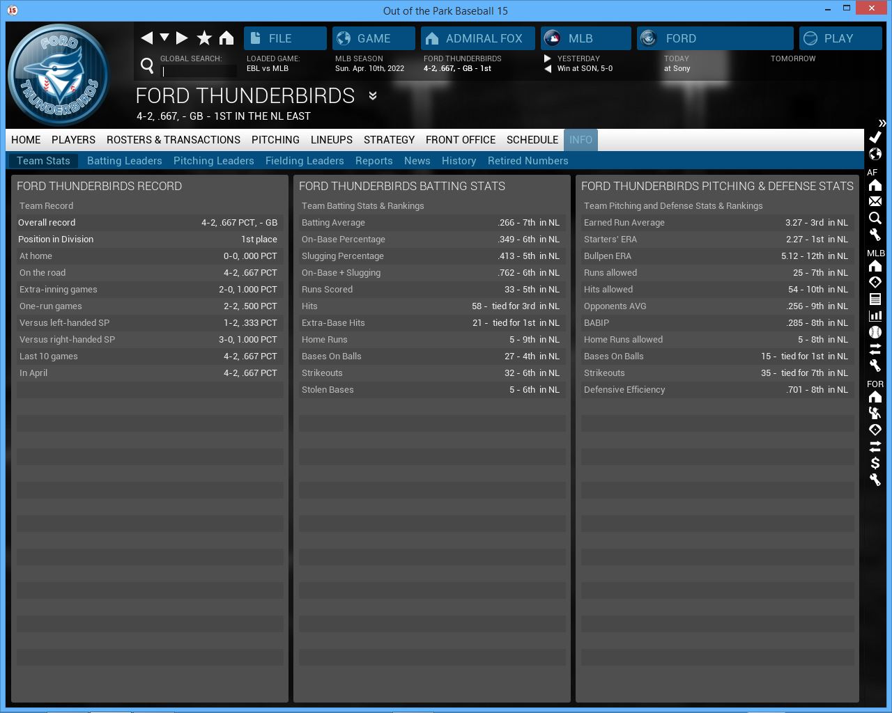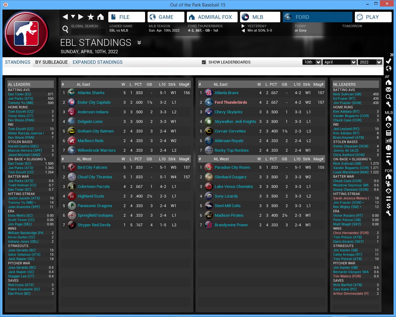EBL Still early but so far Atlantis is dominating. Will they stay atop the East without Kevie Oko for the next 6 weeks? Who will pull ahead in the NL East? A look at the NL West leading Clud City Thrantas. MLB White Sox look like the will dominate the AL west again, while the rest of the division look close. A look at the NL East leading (tied) Cincinnati Reds. CBF Battle Droids are off to a great start while the rest of the league looks more even matched.