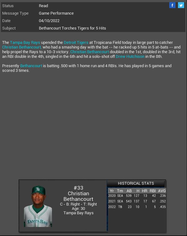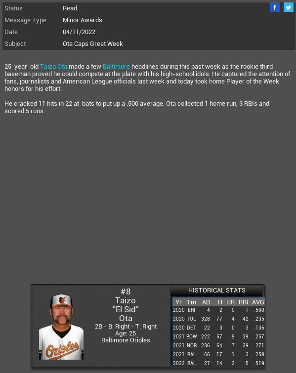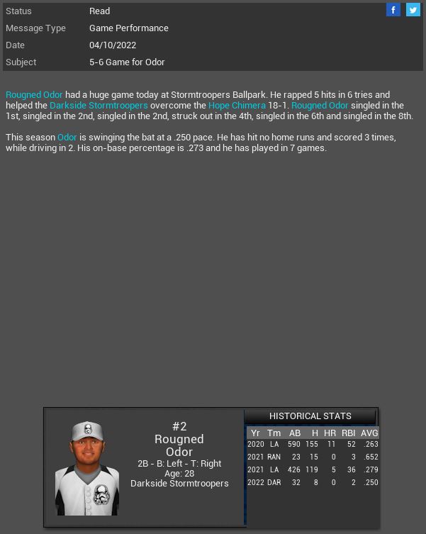 Ford SP Harold Walker & Sony SS Chris Ashford have been suspended for fighting for 3 games. Walker will not miss a start. Tampa Bay Rays C Christian Bethancourt has a 5 hit game vs Detroit. Stormtroopers 2B Rougned Odor has a 5 hit game vs Hope Chimera. Baltimore Orioles 2B Taizo Ota is named MLB AL POTW. Cubs CF Earl Morris is named NL POTW.