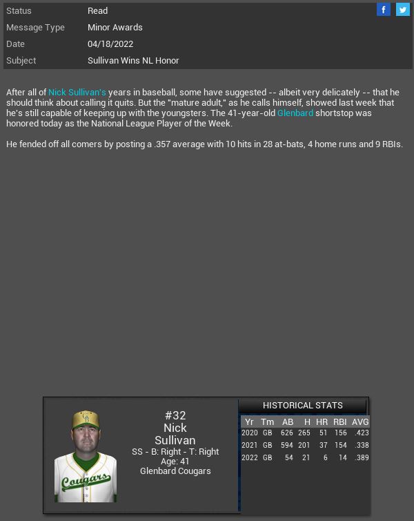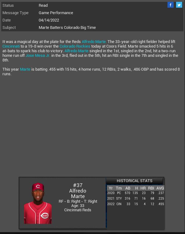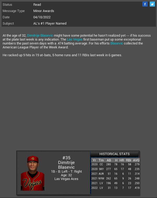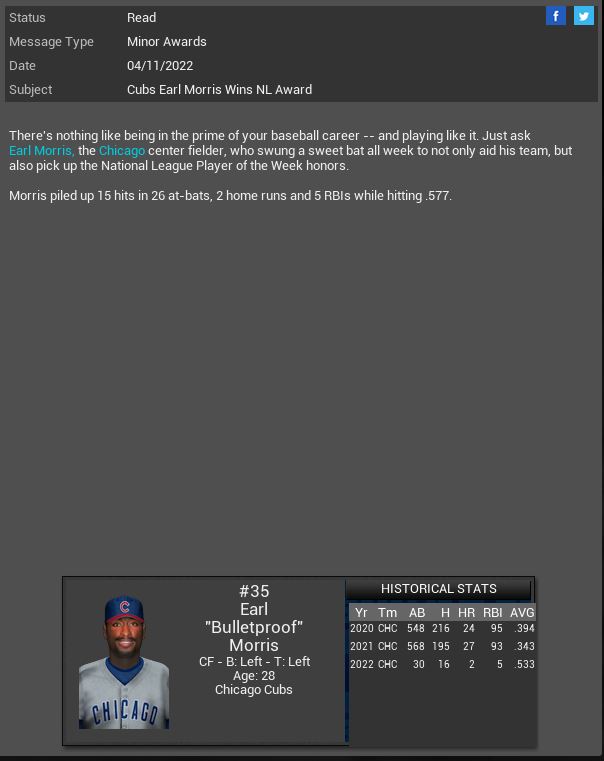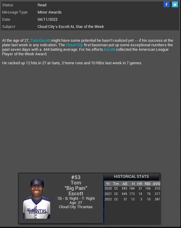 3-3 this week. While we did win 3 in a row we are still struggling late in games. The pen is blowing a lot of games and our hitting is still very sporadic.  The signing of MR Derek Self will hopefully settle our pen down a bit. I hate that Trapp blew everyone away in ST then came out and stunk up the joint once the games mattered. We have several new uniforms.
