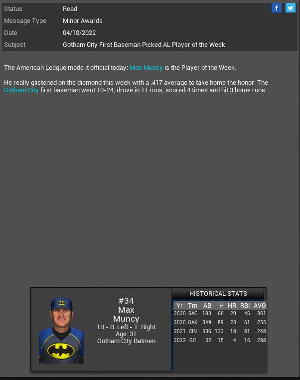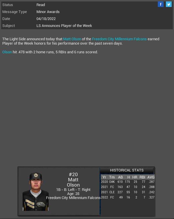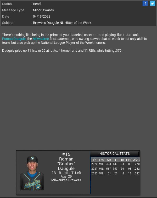 Milwaukee Brewers 1B Roman Daugle is named MLB NL POTW. Gotham City Batmen 1B Max Muncy is named EBL AL POTW. Nick Sullivan is named NL POTW. Freedom City Millennium Falcons 1B Matt Olson is named CBF LS POTW. Battle Droids 3B Nick Castellanos is named DS POTW.