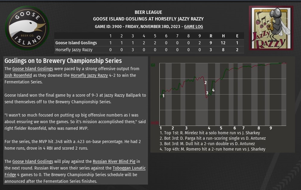 Goslings score early, often to clinch series Goose Island jumped out of the gates quickly, scoring runs in each of the first 5 innings as they claimed a 9-3 series clinching victory in game 6 and advance to the Brewery Championship Series to face Russian River. |