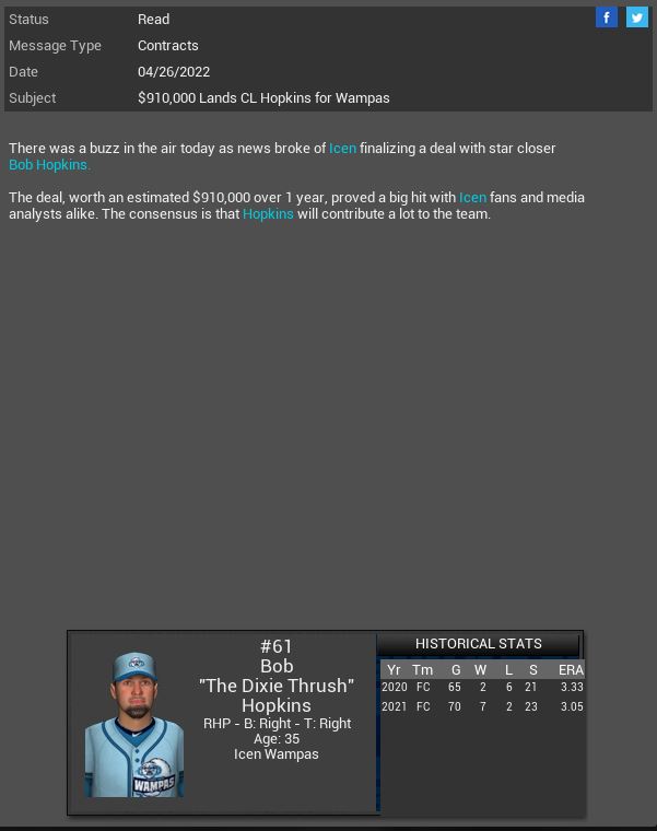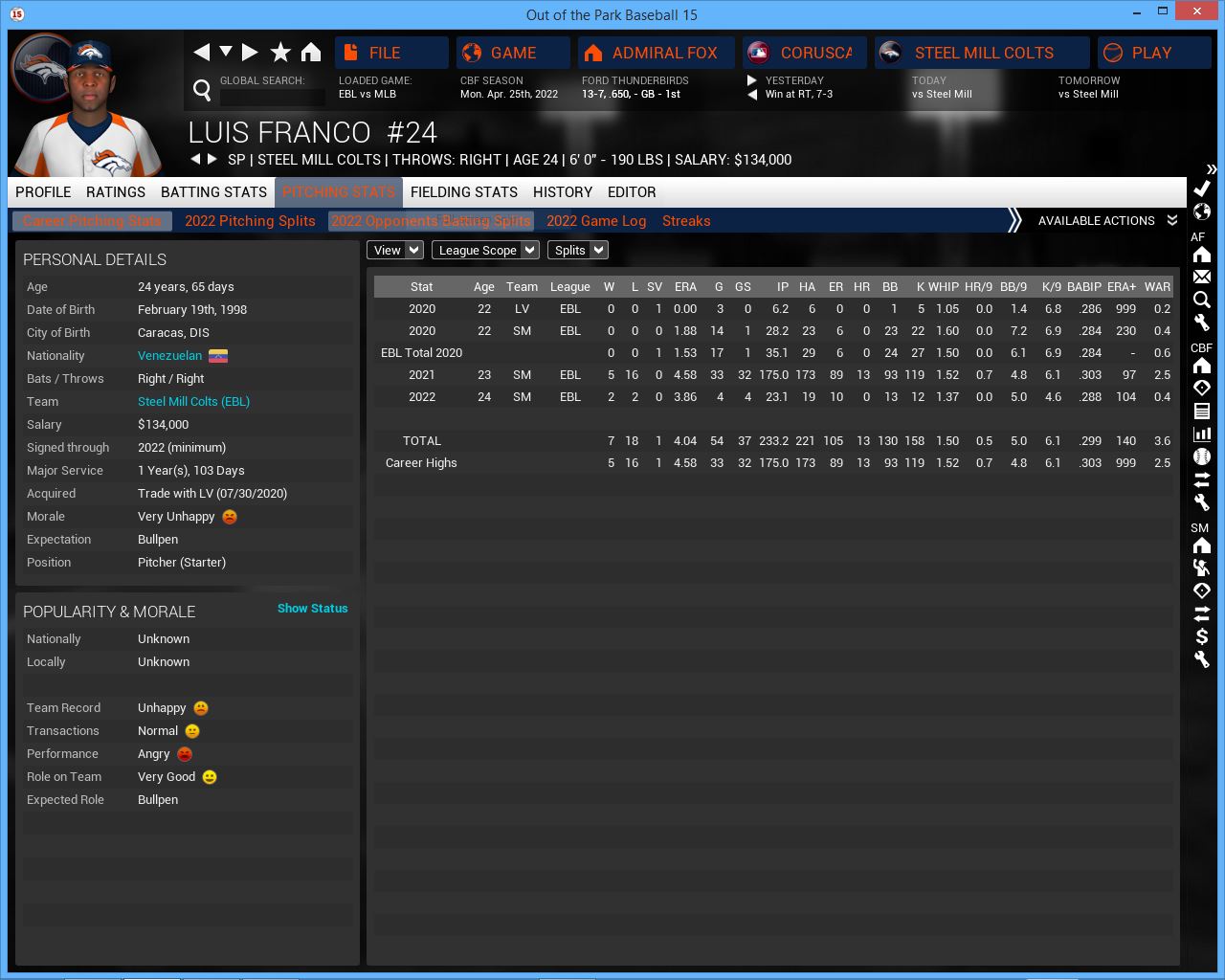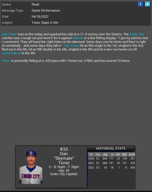 In other news concerning Steel Mill, This will be their final season. Invictus Durasteel has sold the colts to Extensive Enterprises. EE won the right to buy the team by the slimmest of margins. 12 owners voted against EE buying the Colts. EE is suspected of funding COBRA and their terrorist acts on Endor, Earth and several other planets. There were two stipulations upon EE buying the Colts. 1. They will not play in Steel Mill and must play in To Kieren (To Kieren is an underground city in the desert with a population around 1.5 million.) 2. They will have to build a team and organization from scratch. All Steel Mill players will be given their outright release and To Kieren will sign whatever FA's they want including minor leaguers and all coaches. While EE felt it was a tad extreme, they seem to be fine with it overall. Invictus Durasteel Inc. will own a team in the new Illinois Baseball League which will begin play in 2023 on the planet of Illinois, (formerly Bremer) the planet in which I own. Deacon Peabody was placed on the 15 Day DL and will miss 6 weeks. IF Lorence Fajous was recalled from AAA Dopson County. Brain Mack & Stacy Spear will share time at 2B while Toni Kline will move to DH. Fajous is a great defender but I am concerned that he will not be able to hit very well. I might recall Juan San Antonio or Bobby Avalon in the coming weeks.
