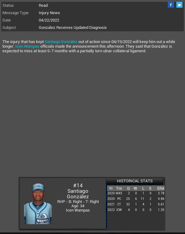 TIE Fighters 2B Dylan Kinney will miss 4 weeks. They then signed 2B Dorssys Paulino. Rocky Top Rockies SS Brodie Greene will miss 4-5 months. Paradise City Roses LF Julio Gonzalez will miss 5 weeks.