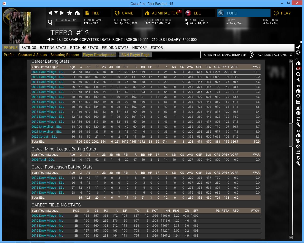 So far they are a .500 ballclub. Wicket seems to have had a resurgence. The Solo brothers are off to a good start. While I dont think that they will truly contend with us & Corvair this season, they could make things interesting. MGR Luke Skywalker, 1B/DH Wicket, 2B Jacen Solo, C Anakin Solo & SP Jaina Solo will all retire following this season. With the exception of Wicket the others are all Jedi and have Jedi business to attend to.