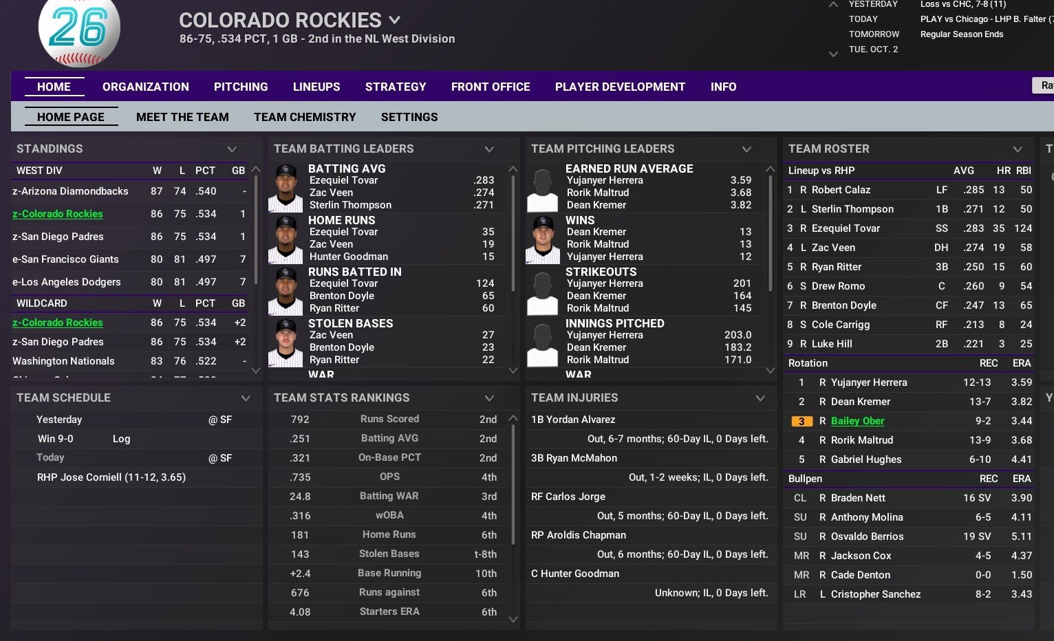 At 86-75, a piece of the National League West Division title isn't out of the question either as the Rockies and San Diego Padres are tied for second only a game behind the first-place Arizona Diamondbacks with only the final game of the regular season left to play. The Padres and Diamondbacks will face off today in Glendale, Ariz. to determine how the division will play out. Colorado last reached the World Series in 2027, when it defeated the Chicago White Sox for the only title in franchise history. |