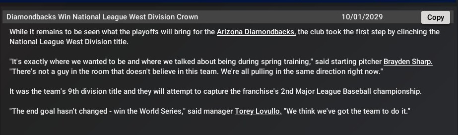The D'backs (88-74), who are in the postseason for the fourth consecutive season, finished a game ahead of the second-place Colorado Rockies in the division and two games in front of San Diego. Arizona reached the World Series in 2023, when it lost to the Texas Rangers. A seven-game win over the New York Yankees in 2001 provided the D'backs with the only World Series title in franchise history. |