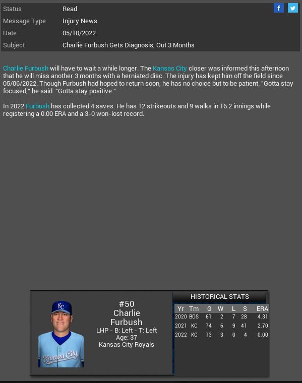 KC Royals lose LHP Charlie Furbush for 3 months.