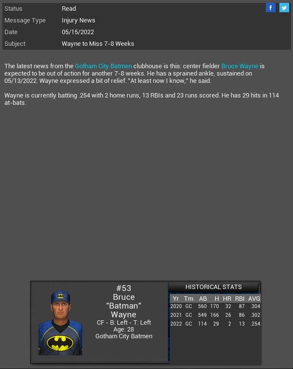 Brewers 2B John Richard has a 5 hit game. LA Dodgers signed 3B Chuck D'Zinnik. NY Yankees 1B Clu Haywood will miss 6 weeks. Bruce Wayne will miss 7-8 weeks.