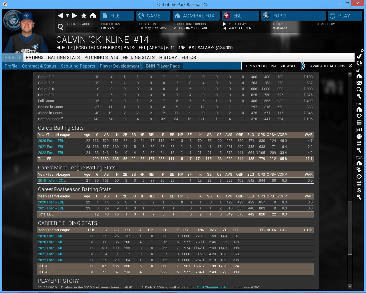 Great week. Calvin Kline is tearing the cover off the ball. Getting on base, stealing at will and even chipping in a few homeruns. We have a tough week ahead of us. 3 @ COR & 3 @ ATS. Burke will be back on Tuesday @ Corvair. Gray will be sent down.