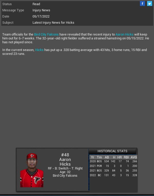 San Diego Padres LF Everett Williams will miss 4 months. Hiroshima 2B Max Dubois will miss 5-6 weeks. Bird City RF Aaron Hicks will miss 6-7 weeks.