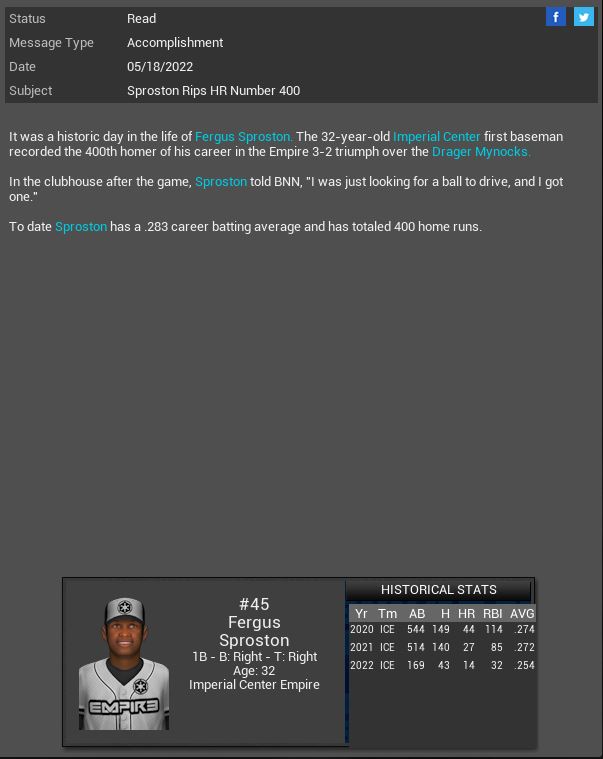 Atlanta Braves 3B Bill Hill will miss 6 weeks. Isotopes SP Steve Martinez will miss 15 months with Tommy John surgery. Cubs CF Earl Morris will miss 4 weeks. Empire 1B Fergus Sproston hit his 400th HR. He is the All Time leader in HR in the CBF.