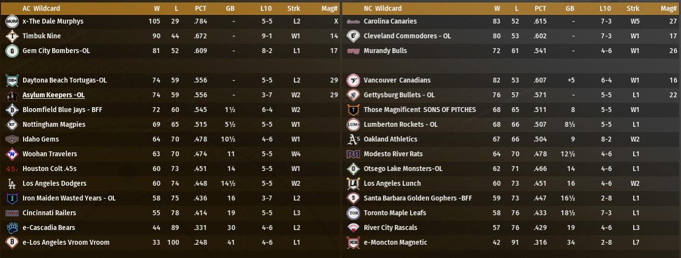 Annandale 6-4 (leading wild card chase) Nowhere Men 5-18 (.500) I will away from my computer and won't be able to do last day of games. There are only a few, but the lead could change: 3 games Lemp Ave v. Annandale 3 games Lemp Ave v. Nowhere Men