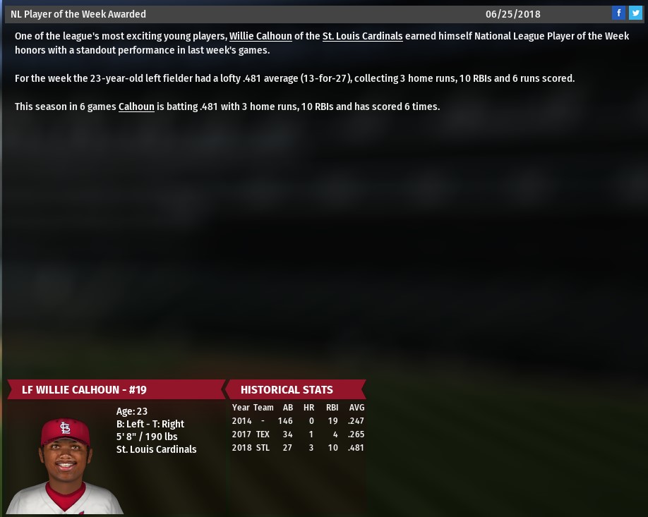 The trade deadline is approaching, but I have nothing that needs to be fixed with the way this group has played over the past month (20-3 since June 24). Moves so far: 1) Carpenter went out for the year on May 7. I traded Lyons and Leone to San Diego for Hosmer (SD retaining 25%) to replace him. Hosmer has hit .297 with 14 HR in 62 games for me. 2) The bullpen was a mess, so on June 1 I traded Holland (STL retaining 50%), Garcia, and Guilmet to KC for Kelvin Herrera to close. Herrera has a 1.53 ERA and 15 saves since joining the Cards. 3) Ozuna missed six weeks with elbow inflammation. On June 19, I acquired Willie Calhoun in a six-prospect deal with Texas. Calhoun went to DH and Jose Martinez covered left field while Ozuna was out. Calhoun has been amazing and was rookie of the month in the N.L. for June. He has cooled off a bit, but he is still a force and adds a much-needed left-handed bat to the lineup. 4) Molina went out with a sports hernia on June 19. Carson Kelly was called up to replace him and has been outstanding. 5) On June 30, I replaced struggling lefty Ryan Sherriff in the bullpen by acquiring LHP Wandy Peralta from the Reds in exchange for prospect C Jesse Jenner (who was behind Kelly and Knizner on the development chart). Peralta has appeared in 8 games with a 2.70 ERA and a very good 0.60 WHIP. He is not just a LOOGY either with a 1.33 WHIP vs. right-handed batters. 6) In order to satisfy my owner and keep the fans happy, I signed Adam Wainwright to a 2-year extension at $10.5 million per year. The second year has a vesting option requiring 22 games started. I could just keep him in the bullpen if he has declined and still avoid the second year of the contract. I am playing out every game so this will take a while to finish (especially since I am simming a second league as GM only) but I am inclined to roll with this group and see how it does. It is certainly a much different scenario from the real Cardinals, who look like sellers this morning. Last edited by Orcin; 06-17-2018 at 10:56 AM. |