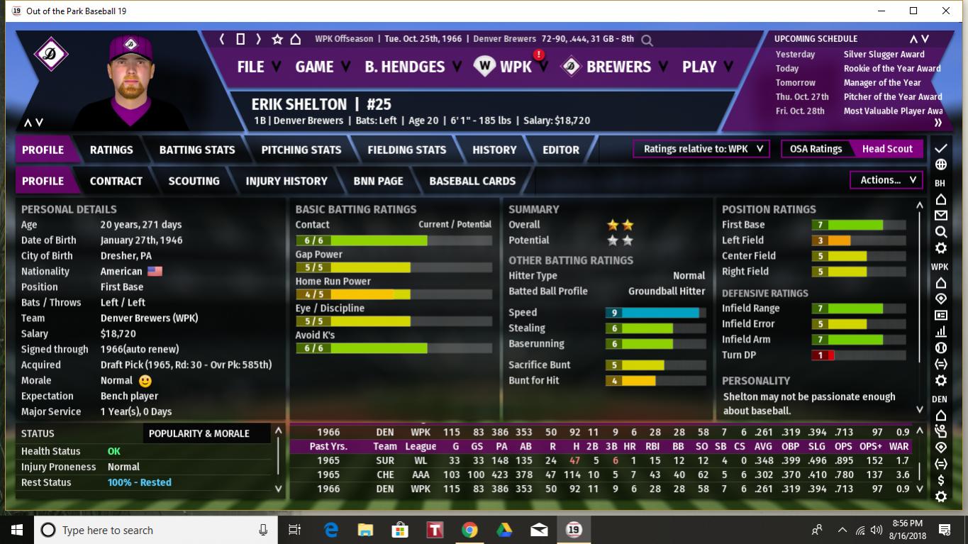 Veteran A.J. White is expected to play more at first this year than his customary thirdbase partially due to the acquisition of Steve Cutrer but also due to the aging White's rapidly deteriorating defensive skills. White had a great year at the plate in 1966 and finished with the top OBP in the MGL (3rd in all of the WPK). And he still has a very strong throwing arm. But he is basically a statue at third at this point and while he will also be a defensive liability at first it is hoped that his bat is still potent enough to merit a good deal of playing time. Young Erik Shelton will split time with White at first and provides a much better defensive alternative plus a decent bat. But really they are both just keeping the position warm for the Brewers top prospect, Bobby Erbakan. There are some who feel that Erbakan has been rushed up the ladder too quickly (he is expected to start at AAA Chester this coming season) but others who point out that his numbers have, if anything, just gotten better as he has moved up and that his competitive nature led him to have very low morale while playing for the weak single A Bainbridge team and the horrendous AA Nashville squad. It is hoped that playing for AAA Chester, the reigning AAA champs, will make him much happier and that he will develop even more quickly in that environment and under a solid hitting coach and very good manager. The thought is that in the next 3-5 years Erbakan will not only emerge as the starting firstbaseman for the Brewers but also as one of the best players on the team and even as a star in the league. Last edited by BirdWatcher; 08-18-2018 at 01:56 PM. |