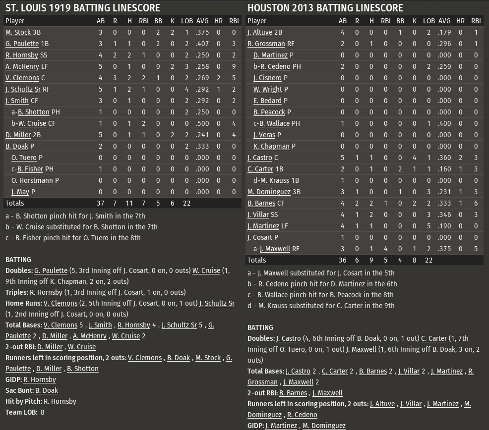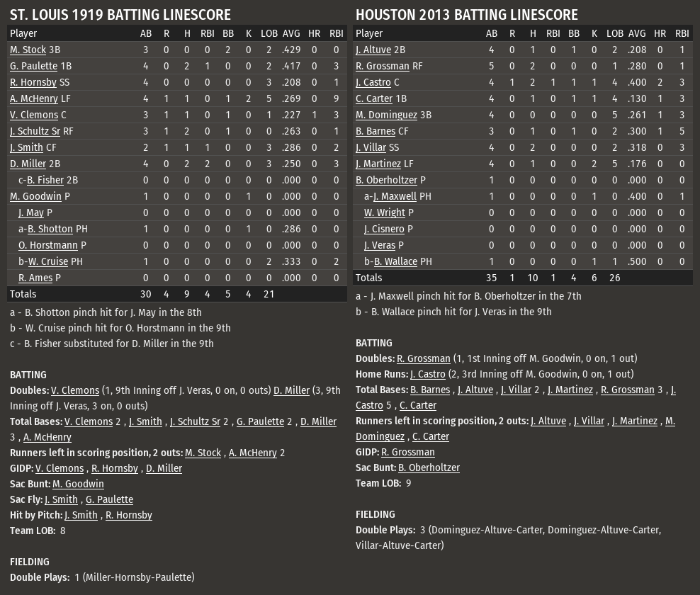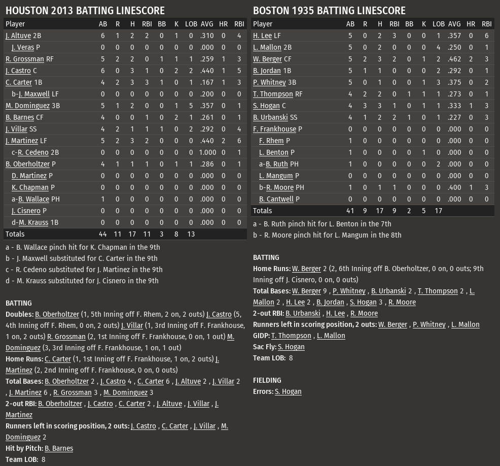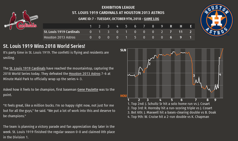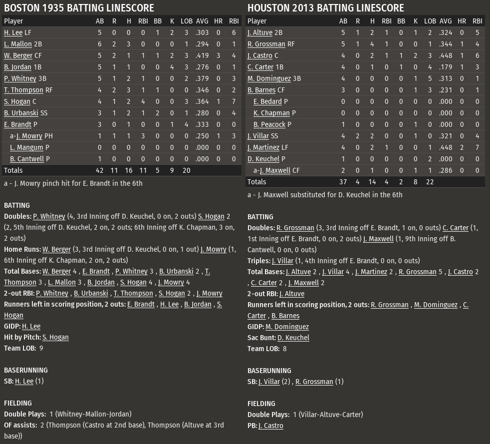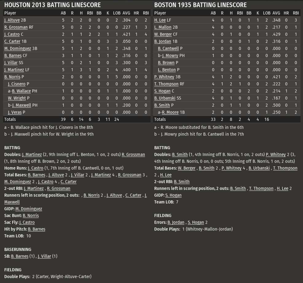 Houston Astros (# 10 / 2013) beat Atlanta Braves (# 1 /1935) 5-3 Game 1 - Boston: Houston Astros vs Boston Braves 4:3 Game 2 - Boston: Houston Astros vs Boston Braves 4:2 Game 3 - Houston: Boston Braves vs Houston Astros 5:2 Game 4 - Houston: Boston Braves vs Houston Astros 4:2 Game 5 - Boston: Houston Astros vs Boston Braves 6:2 Game 6 - Boston: Houston Astros vs Boston Braves 11:9 Game 7 - Houston: Boston Braves vs Houston Astros 11:4 Game 8 - Houston: Houston Astros vs Boston Braves 6:4