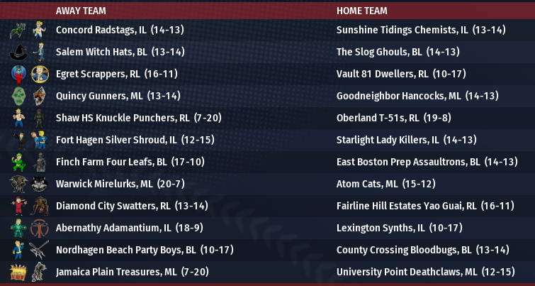 WRVR – EGRET SCRAPPERS (16-11) AT VAULT 81 DWELLERS (10-17) KNOW THE STARS EGR: LF Paladin Danse – Danse may be the front-runner to win the Railroad League and entire CBO Player of the Year honors. He has been that good. Just looking at his basic stats, he is first on his team by .100 in batting average (.468 to Bill Chaney's .368), and he leads the team in home runs (11) and runs batted in (34). V81: 1B Erns Gold – If anyone could challenge Danse for the league's MVP award, Erns Gold may be the person. He is batting .327 today with 10 home runs and 34 RBI. Those five home runs doubles the second-best amount by any other Dweller. PLAYER VS PLAYER – GAME ONE LINEUPS AND STARTING PITCHERS TEAM ANALYSIS The Scrappers' strength is definitely their offense. With Danse leading the way, Egret has scored the RL's second-most runs (204) and are tied for first in power with 41 home runs. They may not lead any categories, but the Scrappers are in the top half of every offensive statistic in the RL besides stolen bases. Center fielder Bill Chaney is currently injured from an unspecified baseball injury, so he is unavailable for this week. The pitching has not been as good. The Scrappers are fourth in runs allowed (185), with the fifth-best starter ERA (6.72) and fourth-best reliever ERA (6.09). Usually, the Scrappers depend on high-scoring games to win. Vault 81, like Egret, is more adept in its offense than its pitching, meaning a high-scoring series is likely. The Dwellers will have to do better when it comes to keeping up with the Scrappers, something they did not do two weeks ago when they were swept by scores of 11-10, 10-4, and 13-7. They could hope for better with the Scrappers missing one of their key offensive players. Vault 81 has not been good in the RL in runs allowed, giving up the worst number of runs (214). Although the starters have not been devastating (4th in ERA at 6.54), the bullpen has allowed way too many runs (6th in ERA at 8.28). For the Dwellers to win the series for the first time this season against Egret, they will need better pitching. PREDICTIONS Dwellers 10, Scrappers 4 Dwellers 12. Srappers 7 Scrappers 10, Dwellers 8 CBO FULL SCHEDULE