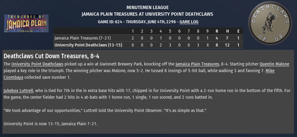 The Confidence Man Minute with Travis Miles This is a transcript from Travis Miles’ post-game sign off of Game Three of the DCR Series of the Week. This is "The Confidence Man Minute." I'm your confident host, Travis Miles. Let's talk about this weekend in the Minutemen League. With today's 13-7 count, the University Point Deathclaws won the series against the Jamaica Plain Treasures. With the win, the Deathclaws push their record to 14-16 on the season, which means they could be tied for fourth place with the Quincy Gunners, depending on the Gunners' game tonight at Goodneighbor. The Treasures fall to a CBO tie for worst with Shaw High School, who is losing 26-4 entering the top of the ninth inning and is most likely to lose. The Treasures are 8-22 with the loss, now six games back in the Minutemen League of the Deathclaws who currently hold fifth place. It will be a tough time for the Treasures to climb out of that position. They can be encouraged by their Game 2 win, though, where Mike Van Noord and Cody Flatt each pounded out two home runs and drove in 10 runs between them in the Treasures' 11-4 win. Otherwise, it was all University Point here at Gwinnett Brewery Park. Jukebox Luttrell continued to produce, including his 8th home run in Game One. Today, he was 4 for 5 with a double, a run, and three runs batted in. Jamie Pipegun did well from the leadoff spot, hitting his 5th home run of the season in Game One. Like Luttrell, he was 4 for 5 today with a double, three runs scored, and an RBI. Ace Quentin Malone pitched really well in Game One, allowing only one earned run and three runs overall in eight innings to move to 5-2 on the season. Next week, Jamaica Plain hosts Goodneighbor, while University Point will host the Atom Cats. As I am saying this, the 15-14 Cats lead 22-7 Warwick 5-3 in the top of the third of that game. Goodneighbor, who is 15-14, plays the 14-15 Quincy Gunners tonight. Next week, we at DCR are watching the Railroad League's Vault 81 Dwellers, currently at 11-18 and in fifth place, when they travel to the fourth place Diamond City Swatters at 15-14, who needs a win this afternoon at Fairline Hill Estates to move into a third place tie. That game is in the bottom of the 3rd with Diamond City leading the Yao Guai 3-1. OK. That will do it for me this week. Have a great week!