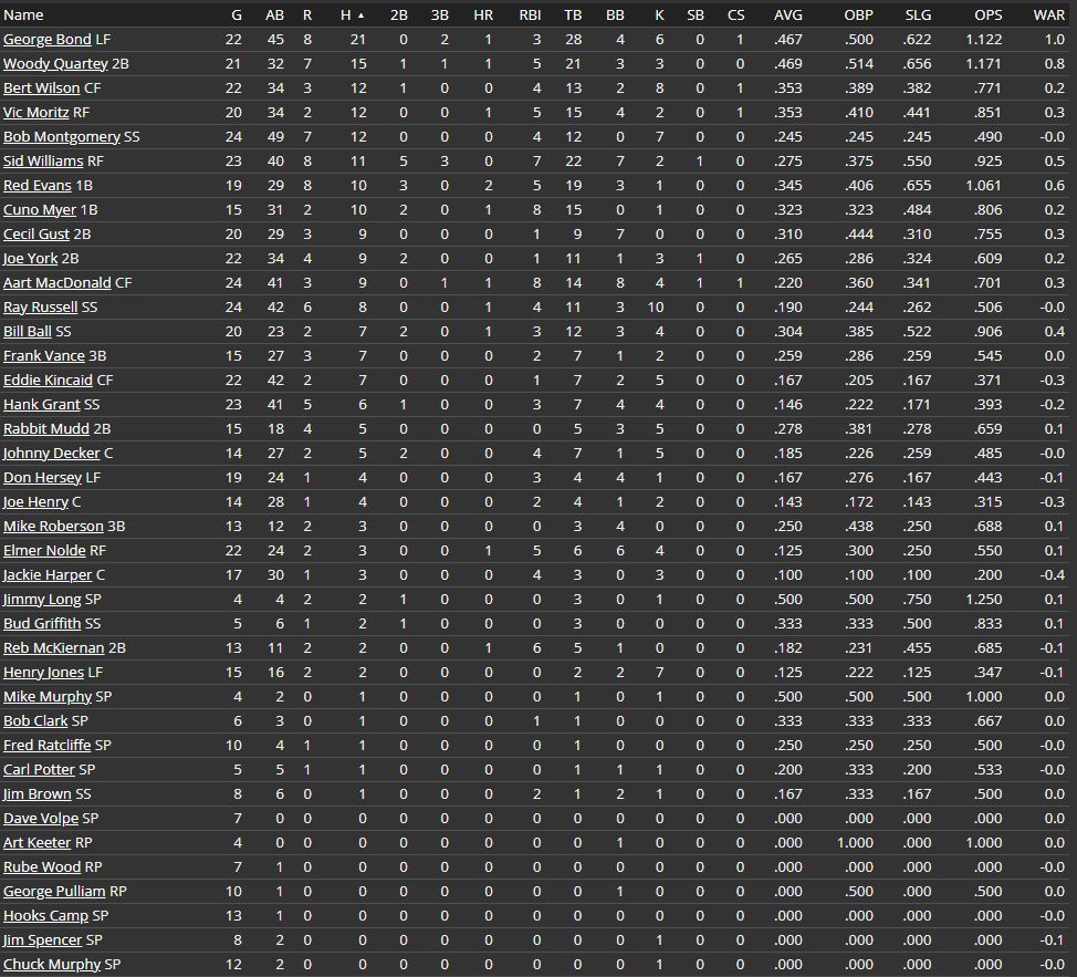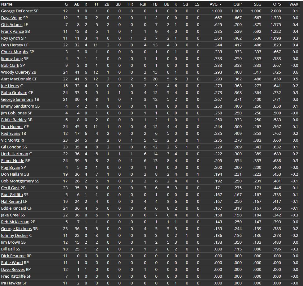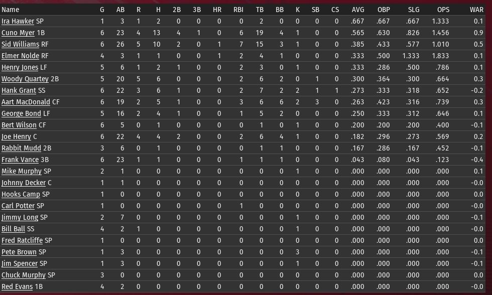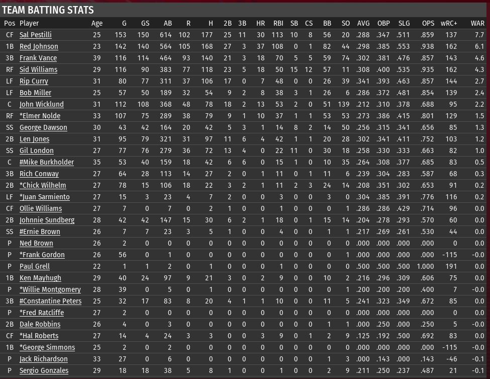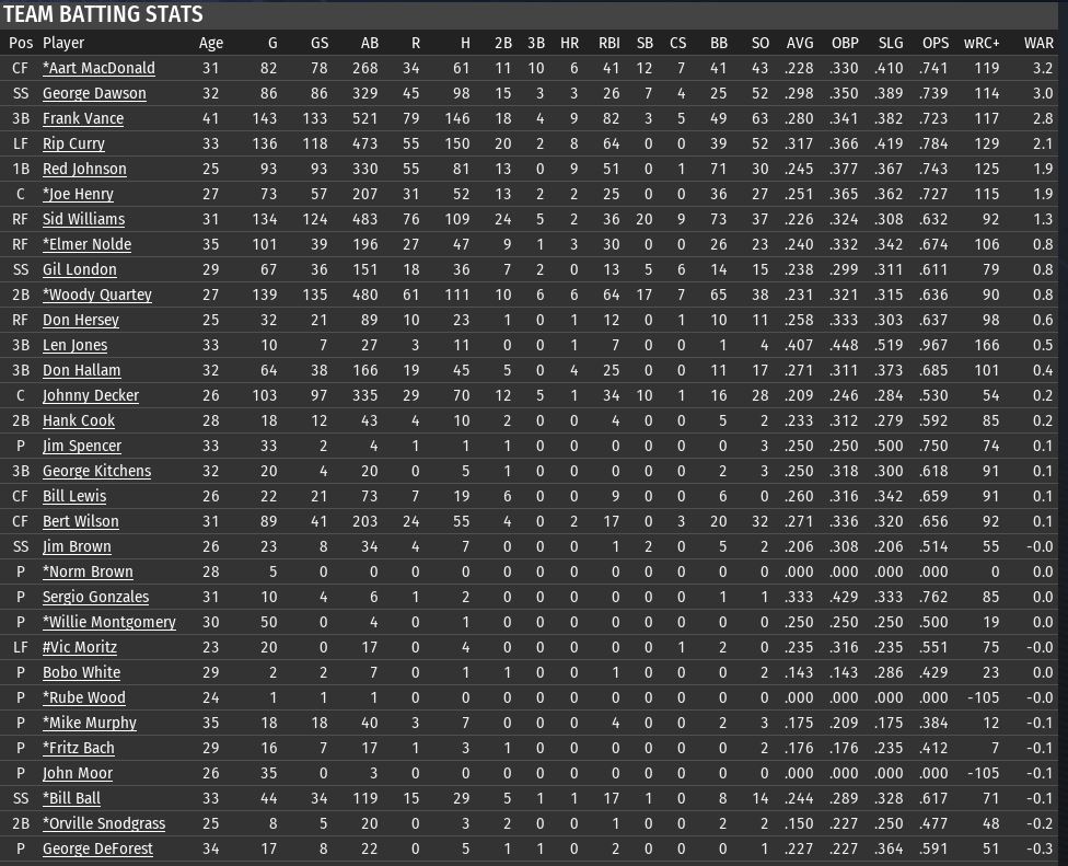 Detroit World Monday April 17th, 1945 Opening Day Roster and Prediction Special Part 2 By “Fast” Freddie Farhat Continuing on we will go down the list of position players that made the Opening Day Roster. Catchers (Starters noted with *) *Joe Henry (B-L - Age 29) Last Season 263/377/687 0-42 Spring Training 143/172/315 0-2 Henry has been a solid option at catcher the last several seasons. What the club needs to find is a right handed version of Henry. Of all the positions that we are waiting for the boys to come home from the war, this might be one of the biggest areas that needs help. Henry and Rick York might be a good combo some day. Johnny Decker (B-R - age 28) Last Season 221/272/535 0-9 (Detroit) AAA Newark 256/340/740 1-7 Spring Training 185/226/485 0-4 Decker’s first 21 at-bats this spring was ugly0-21. He managed to go 5-10 in the last week to salvage some pride and claimed the backup spot. While we said Hooks Camp’s spot on the pitching staff is in serious jeopardy, Decker’s spot might be in even more precarious danger. Summary - Henry is a solid supplemental option as a starting catcher and he has shown some ability to get on base. Decker is a disaster and if anyone is available to backup at catcher on the waiver wire expect Decker to be gone….gone…gone! Infielders *1B Cuno Myer (B-L - Age 30) Last Season (with Detroit) 306/371/710 0-24 Spring Training 323/323/806 1-8 Myer hits well and can be a solid #2 or #3 hitter in a lineup, but he is not a typical 1B masher. He will hit for a solid average and get on base so the Dynamo’s will likely try and put him in the #2 slot behind Sid Williams. Don’t expect 5 home runs from him though. *2B Woodie Quartey (B-L - Age 29) Last Season 278/329/732 1-9 Spring Training 469/514/1171 1-5 Quartey wasn’t going to likely make the team this spring but then had a fabulous training camp. With it he not only earned a spot but will start against RHP pitchers over Rabbitt Mudd. We will see if Quartey. Defense is not his speciality so if he isn’t getting on base at a decent clip expect him to be back on the bench. 2B/IF Rabbit Mudd (B-R - Age 36) Last Season - returned from 2+ year duty in Air Force Spring Training - 278/381/659 0-0 Mudd returns from military service earlier than most and will be the starting 2B against LHP to start the season. He didn’t have a ton of rust with his bat during the spring, but clearly he could use more appearances to find consistency. Odds are he will be starting more and more games soon. *3B Frank Vance (B-R - age 42) Last Season 294/374/777 6-67 Spring Training 259/286/545 0-2 Vance returns for 17th big league season. The Dynamo’s all-time leader in a ton of categories, he will likely play in more games by the end of the season than anyone who has ever worn a Dynamo’s uniform passing RF Phil Thompson 1687 (retired in 1919). Barring injury Vance 1621 will likely break the record around the All-Star game or by the end of July. The Dynamo’s will need Vance to be close to his best to be a serious contender this season. *SS Hank Grant (B-R - age 28) Last Season 297/355/743 0-28 Spring Training 273/333/652 0-2 Grant came to Detroit from Montreal at the end of May last season. Grant responded with solid numbers in his run with Detroit and will continue to be the starting SS this season. Grant was slotted to play 2B last year but Gil London played so well there that Grant slide back over to SS. Maybe the Dynamo’s should consider that move back to 2B for Grant who is not a great defensive SS. 1B Red Evans (B-L - Age 28) Last Season 298/416/866 16-88 AAA Newark Spring Training 345/406/1061 2-5 Evans only got a brief try at the big league level in 1943 with 98 PA’s and hit just 151. Last season he was probably the MVP for Newark with the bat as they won the Union League crown. Great spring gives him another shot in the big leagues and his likable personality will likely keep him around for the whole season. SS/IF Bill Ball (B-R - Age 35) Last Season 235/311/632 1-30 Spring Training 304/385/906 1-3 The team captain requested a trade in the off-season but the Dynamo’s couldn’t give him away even to a team that was trying to acquire more players with the first name of Bill. He has actually hit for a higher average the last 2 seasons (244 & 235) than he has for most of his career the last decade. Ball will backup but if he complains too much I can see the Dyanmo’s just saying goodbye and good luck. Summary - There is a lot of age and a lot of AAAA players here on this roster. The Dynamo’s need to see Frank Vance continue to drink from the fountain of youth. Cuno Myer needs to be a guy in the top couple spots that gets on base so that maybe Vance, Bond, Henry can have a chance to drive him in. Can this group produce enough to give the Dynamo’s enough ammo to help support a young core group in the rotation? Outfielders *LF George Bond (B-R - age 37) Last Season 297/403/839 4-17 (36 games) Spring Training 467/500/1122 3-8 Bond returned to the big leagues as a regular down the stretch of the season for the first time since 1935 when he was in St. Louis. The only other time he played in a big league game was 1 game with Philadelphia in 1938. He has been with the Dynamo’s organization mainly in Newark (AAA) since September 1939. To say he was a pleasant surprise last season is an understatement and he will be a lot of starts at the beginning of the season but also give way to Henry Jones in some games against RHP’s. *CF Aart MacDonald (B-L - Age 33) Last Season 204/289/649 6-42 Spring Training 220/360/701 1-8 Some have said Detroit should just let MacDonald go and play a full season as the starter. He has come out of spring training starting in CF the last several years only to see Manager Dick York grow tired of his paltry batting average. Yes he has a little pop and has driven in some runs so he will get the nod to start the season once again. The question is would he start 100+ games thi