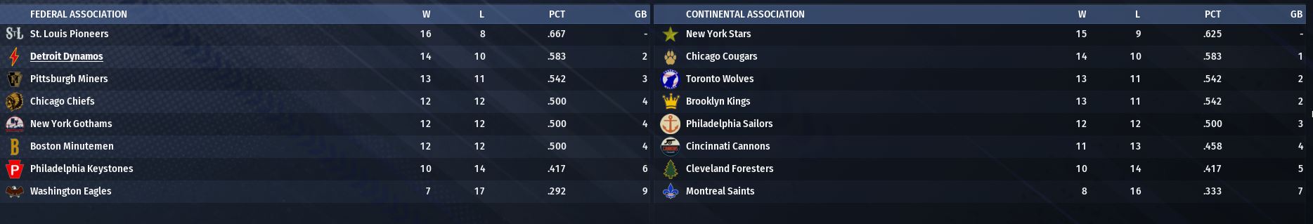 ooc - I had a big post in process but I stupidly didn't back it up and lost it when I left my computer. So because this team isn't very good I've decided not to take the time to redo that post. The OSA picks the Dynamo's to finish dead last in the FA and that might be hard to argue. 7 other "top" reporters chimed in with their picks and 4 of them agreed with the OSA and tabbed the Dynamo's to finish last. Two picked them to finish 7th and one soul out there picked them to finish 6th. So where do I see them finishing? Here goes the "fast" Freddie Farhat Predictions FABL 1944 Season Federal Association Philadelphia Keystones 87-67 Chicago Chiefs 86-68 Washington Eagles 83-71 Pittsburgh Miners 80-74 St Louis Pioneers 78-76 Boston Minutemen 77-77 Detroit Dynamos 67-87 New York Gothams 58-96 Continental Association Chicago Cougars 97-57 Cincinnati Cannons 87-67 Toronto Wolves 82-72 Philadelphia Sailors 81-73 New York Stars 69-85 Montreal Saints 69-85 Brooklyn Kings 68-86 Cleveland Foresters 63-91 |