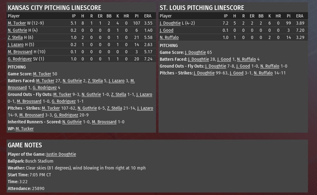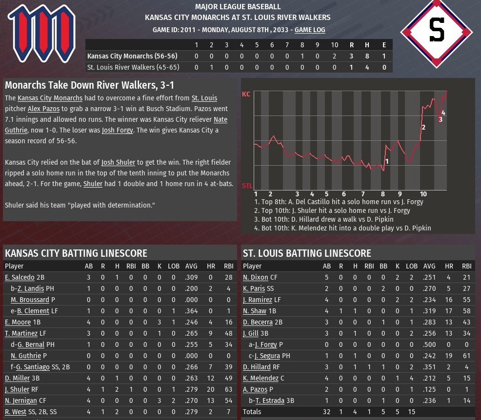 Kansas City scored a pair of runs in the top of the first inning off St. Louis starting pitcher Justin Doughtie, and the Monarchs made it hold up winning 2-1 at Busch Stadium (2006). It started in the top of the first with a lead-off walk to Cole Wagner. After a fly out, Josh Shuler drew another walk. Wagner was thrown out stealing for the second out while Darren Miller was at the plate. Miller, however, came through with a double scoring Schuler. Ed Moore followed with a single to plate Miller. St. Louis got its lone run in the bottom of the second off Monarchs starter Mike Tucker. Jared Thomas drew a lead-off walk and scored on a Jovan Gill single. That would be the extant of the scoring, although the River Walkers outhit KC 11-6 and left eight runners in scoring position. Tucker (12-9) earned his 12th win by going 5.1 innings, during which he allowed one run on eight hits. He struck out four and walked two. Nate Guthrie finished off the sixth for KC. Four relievers -- Zachary Stella (1.0 IP), Jose Lazaro (0.1), Matt Broussard (0.1) and Grayson Rodriguez (1.0) -- combined to finish the game for the Monarchs. Rodriguez earned his first save. |