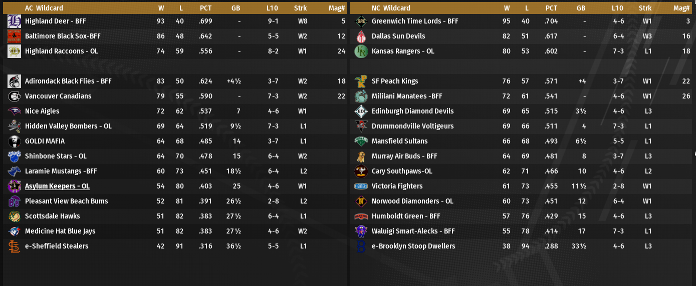 Hooterville is having a fantastic season in both OL and PT. In OL they have a magic number of one with nine games remaining. Norwood, also with nine games remaining would have to win them all while the Haymakers drop all nine to win the title. Both teams have three games today, first up Norwood travels to Jefferson Valley and Hooterville boards a flight for Cochise County. More than possible that the champagne will be flowing in the Haymakers Clubhouse late this afternoon.