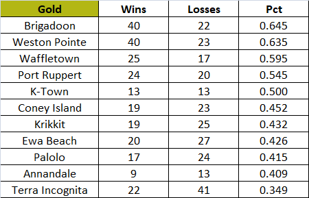 In PT play only Hooterville and Norwood qualified for the playoffs as division winners. The Haymakers will take on the winner of the WC game-either Texas of Peterborough. Hooterville had an identical 4-3 record vs each team in the regular season. Norwood will take on Danville and own home field in the best of five. Norwood only managed to win two of six vs. Danville in the regular season. Jefferson Valley had the WC seemingly wrapped up but lost 6 of its last seven including a 163rd game vs Peterborough to finish one game out. Nobody will be relegated and promotion will be decided by playoff results. |