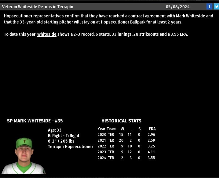 Terrapin Hopsecutioner have come to an agreement with long time starter Mark Whiteside to a 2 year extension. Whiteside was an 8th round pick in the inaugural Beer League draft. Over his 4+ year career, he has a record of 55-38, with 852.2 innings pitched, 710 strikeouts, a 3.22 ERA and an 18.4 career WAR