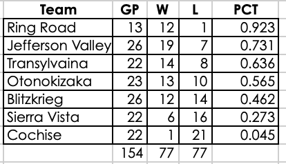 Not much has changed in PT play. Ring Road, Jefferson Vally and Transylvania lead their divisions. Blitzkrieg is holding the second WC in a tight race. Currently Sierra Vista and Cochise County are facing relegation. |