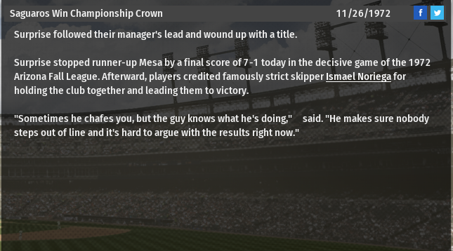 The Surprise Saguaros, the AFL team which features many Denver Brewers prospects, had a great season, finishing 20-12, and have claimed the 1972 AFL Championship crown.