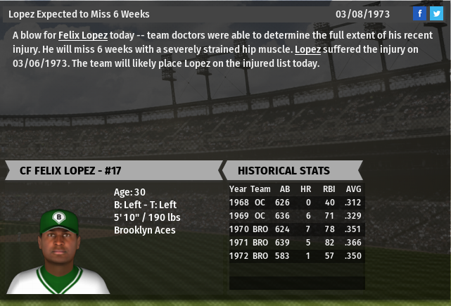 The Brooklyn Aces star center fielder, and 1972 MGL MVP, Felix Lopez will apparently open the 1973 season on the Injured List. The 30-year old speedster suffered a severely strained hip muscle a few days ago and is expected to be sidelined for at least 6 weeks.