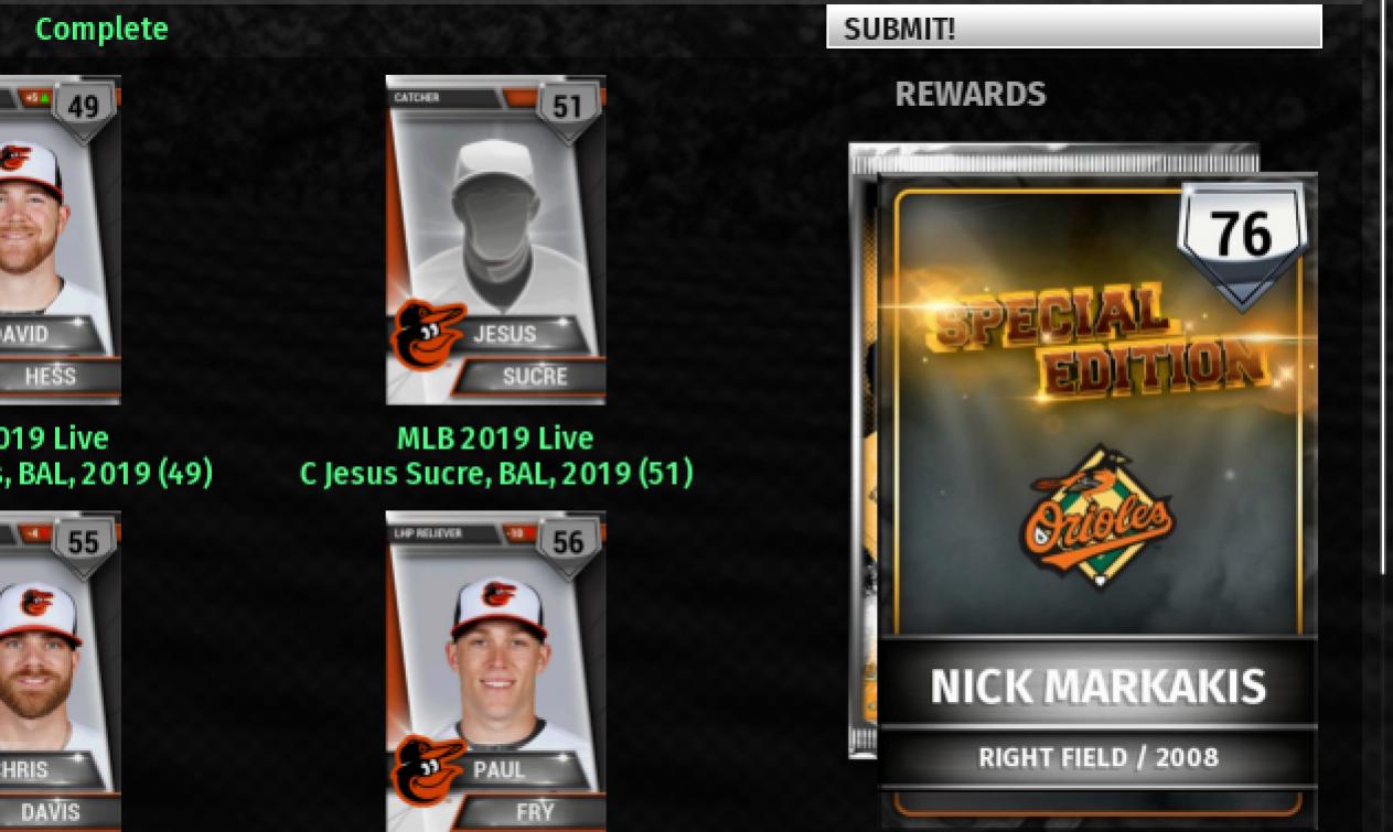 Haha - I've got an Orioles theme team and I didn't even try to do the Live Orioles collection. I just bought the Markakis card outright!
