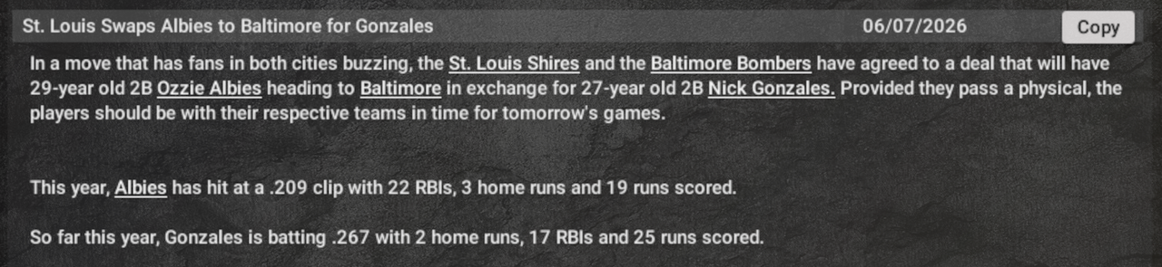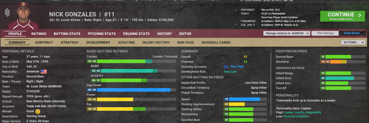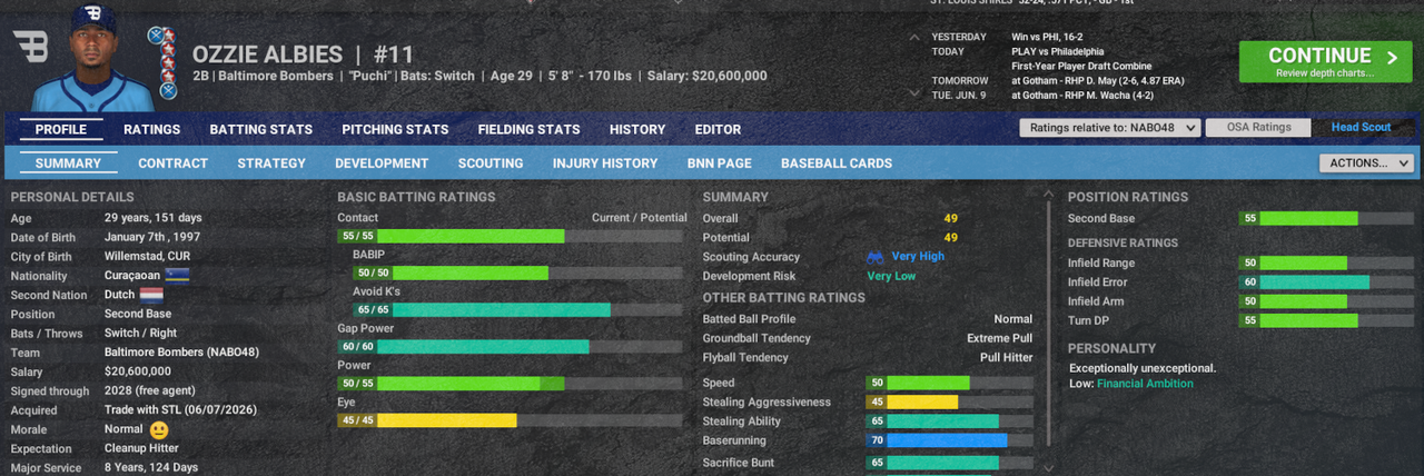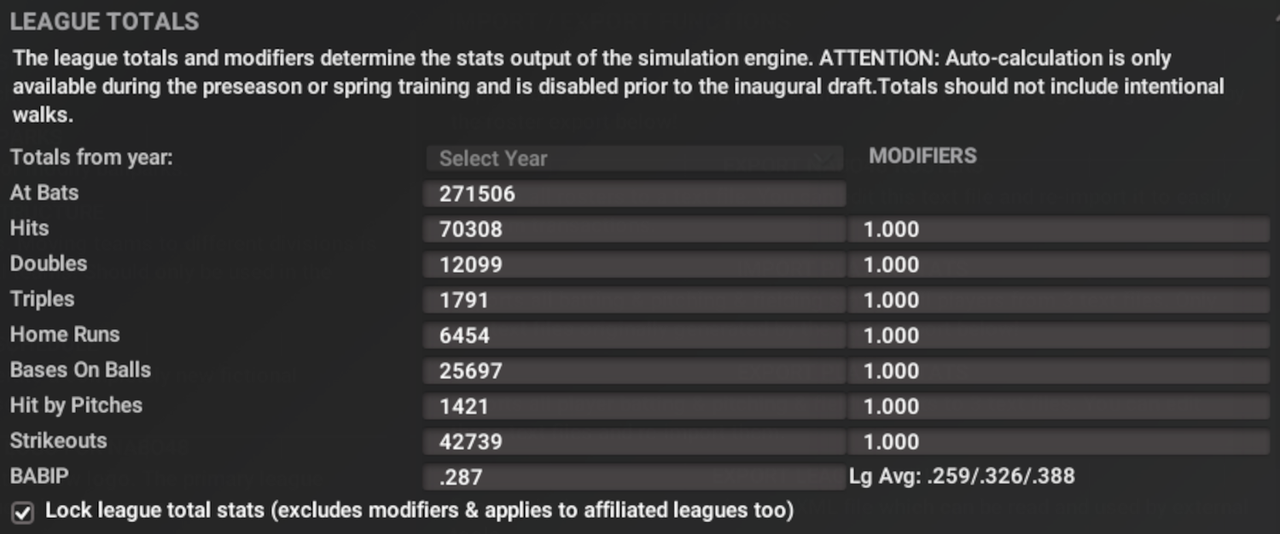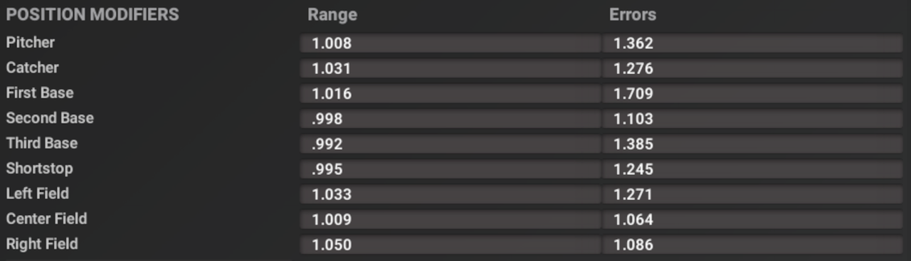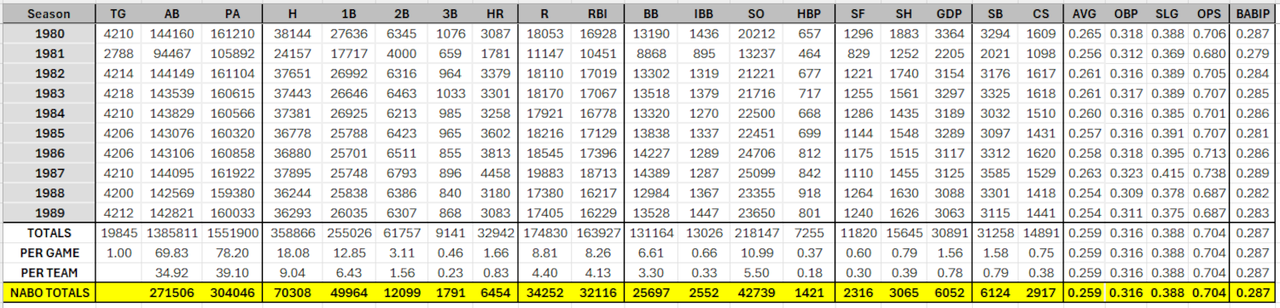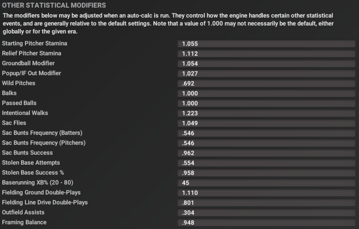 [1] Stolen Bases are out of control, and my team is one of the teams that is benefitting the most ..... where some games look like 10U baseball, where if you get on base, you're at least going to wind up at 2nd, and probably more. Some teams have 3.5 SBA per game, which is not realistic, nor balanced ... and the "singles and stolen bases" teams are getting an exploit. [2] Almost no GIDP. DP are destructive/exhilarating depending on which teams hit into it. They're not super common, but regular enough ... and they were a major factor in the 80s. I went to do the following work some time ago, but the multiple season feature at FG was being goofy, but it worked this time .... ![]() The 1980s, league totals. Then converted to per game, then translated to NABO48 size and scale. This was the original idea, but I did not have the FG datya to scale, so I used the league totals from selecting each year in the OOTP on the Stats and AI tab, but without the scaling. So, here's the OOTP league totals ... ![]() Stat Modifiers ... ![]() Position modifiers ... ![]() So far, so good. In 19 TG, my runners have 18 SB with 10 CS. It's still a lot of SBA, but it used to be this amount plus amount, and with 1/3 of the CS. So, there was "always a runner on 2nd" it seemed. So, using these reality based stats and AI is likely to hurt my offense more than it's going to help my pitching, but it should be a more realistic experience. Before the bats seemed a little nerfed, needed to tweak the baserunning and defense a bit, but this should play realistically, as intended from the onset. |
