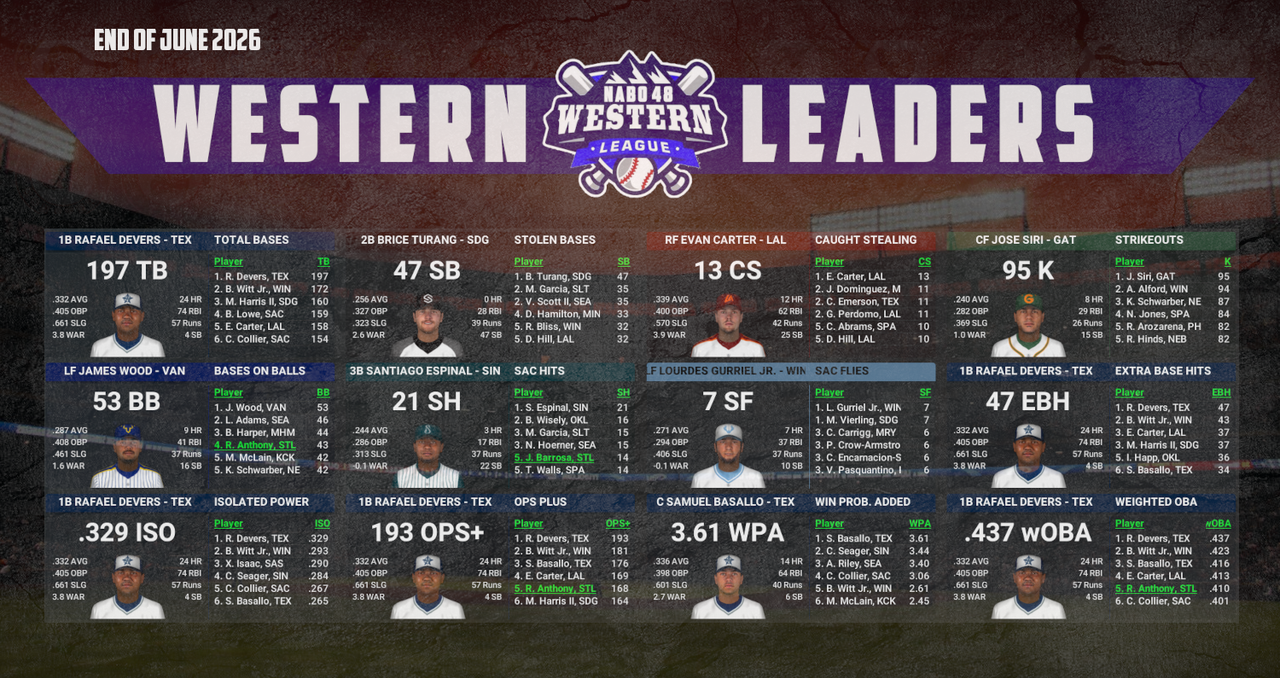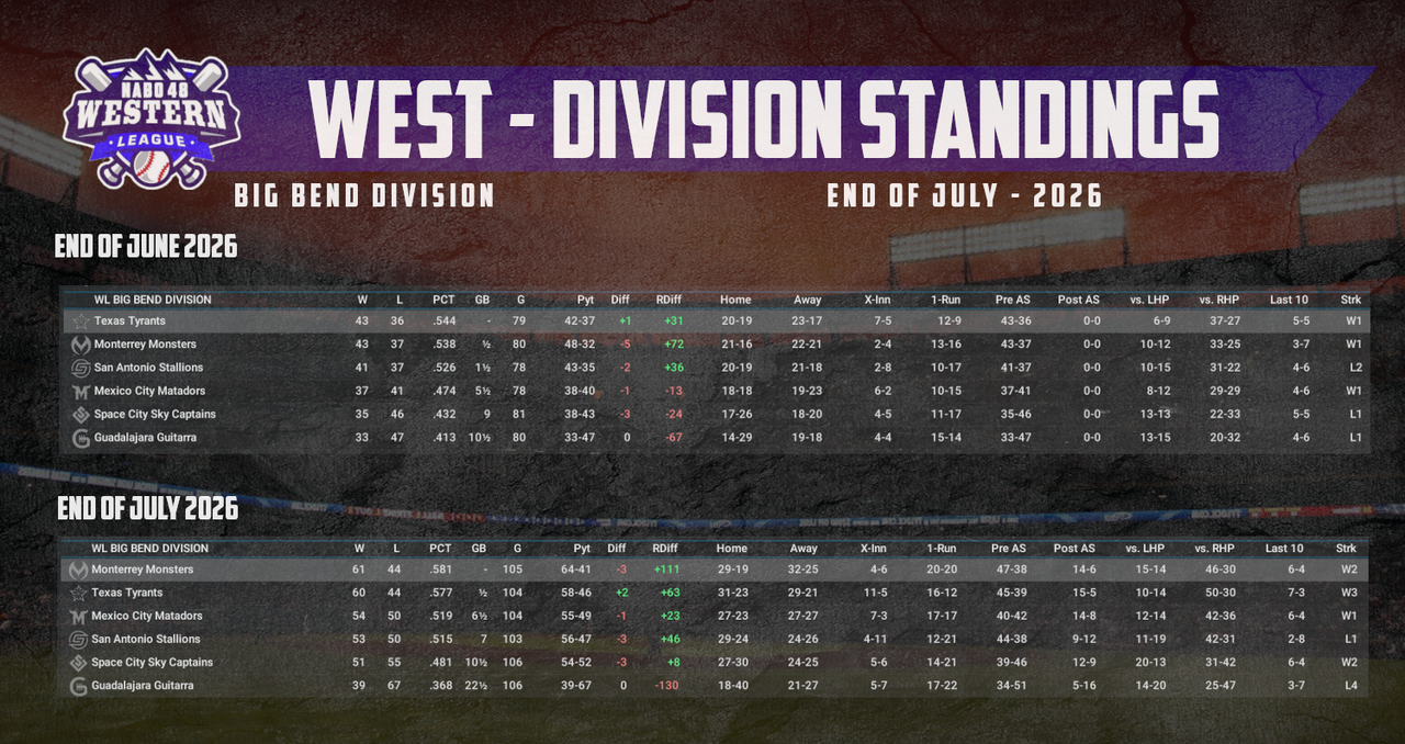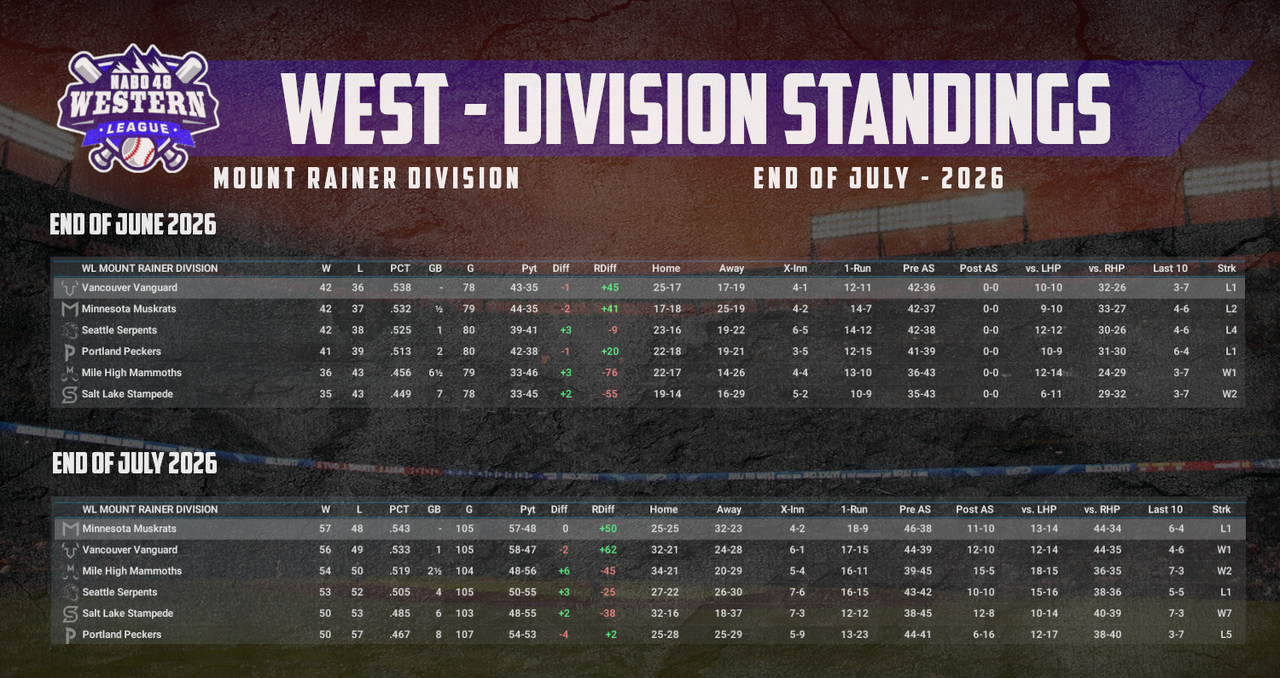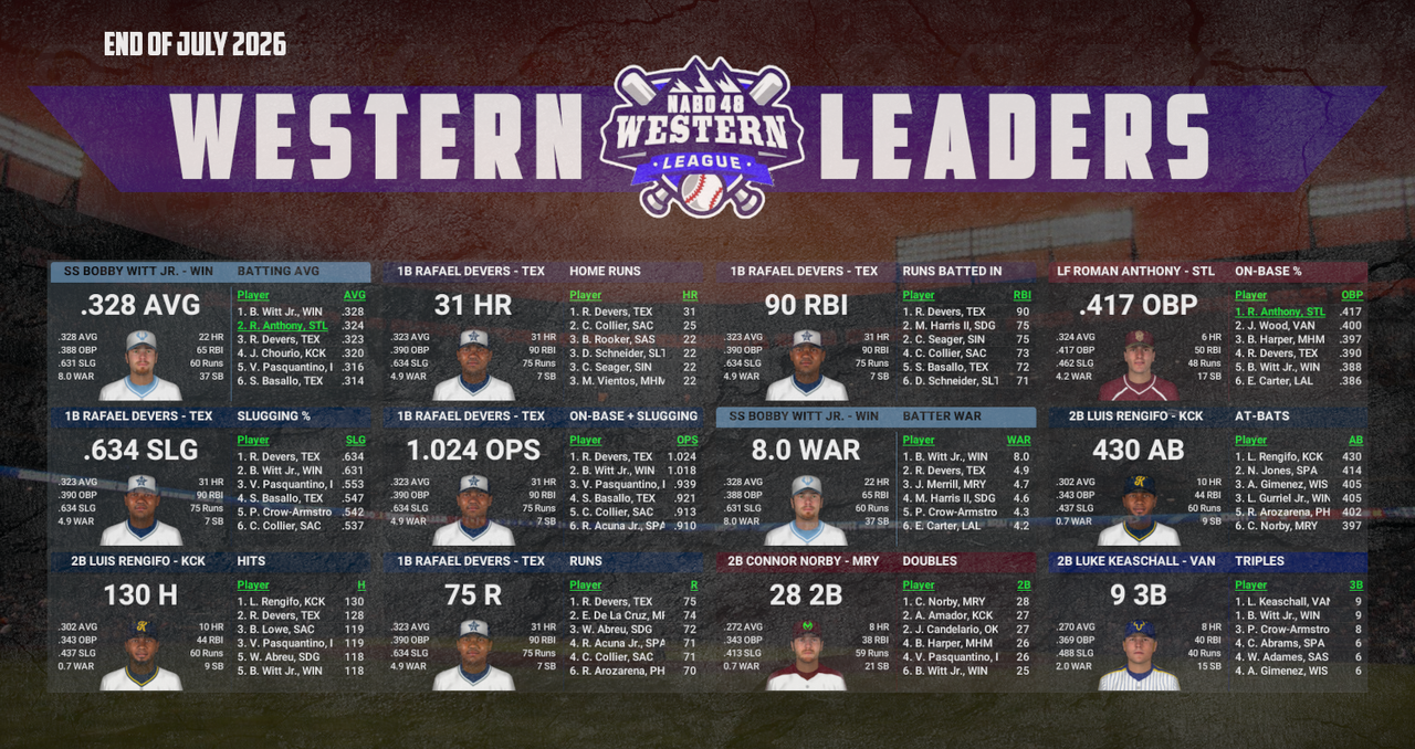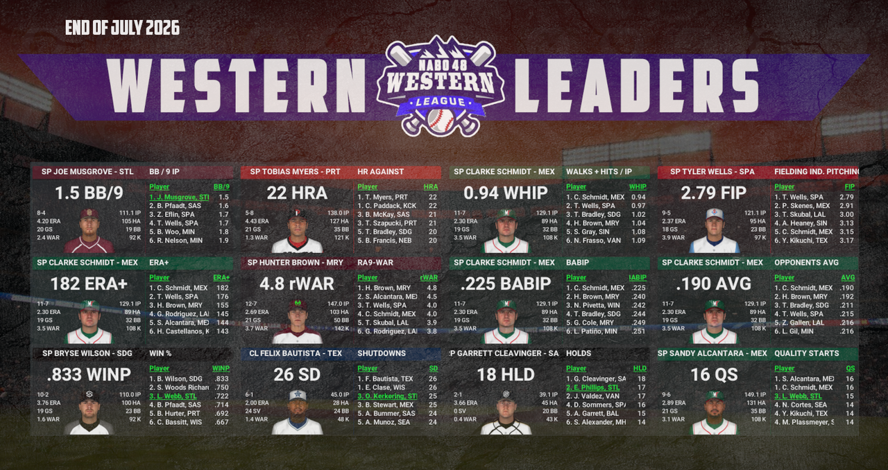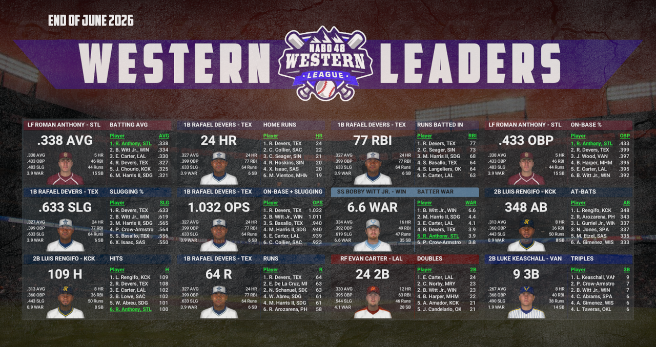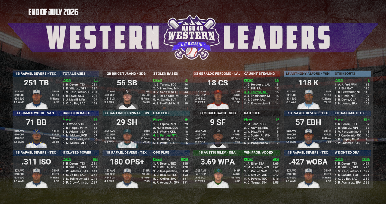 ![]() ![]() EAST - MVP RACE ----------------------------------- [1] Ju. Rodriguez MON - 10.5 [2] K. Tucker MON - 9.8 [3] S. Ohtani NAS - 9.8 [4] C. Williams MON - 8.6 [5] Y. Alvarez NYN - 8.6 [6] F. Lindor DOM - 8.5 [7] J. Soto GTHJ - 6.8 [8] M. Winn DCD - 6.7 [9] T. O'Neill HAV - 6.2 ![]() ![]() WEST - MVP RACE ------------------------------------ [1] B. Witt Jr WIN - 11.2 [2] R. Devers TEX - 8.1 [3] J. Merrill MRY - 7.0 [4] P. Crow-Armstrong PHX - 6.7 [5] M. Harris II SDG - 6.6 [6] C. Collier SAC - 6.6 [7] A. Riley SEA - 6.4 [8] E. Carter LAL - 5.7 [9] M. Yoshida WIS - 4.8 [10] C. Seager SIN - 4.7 |