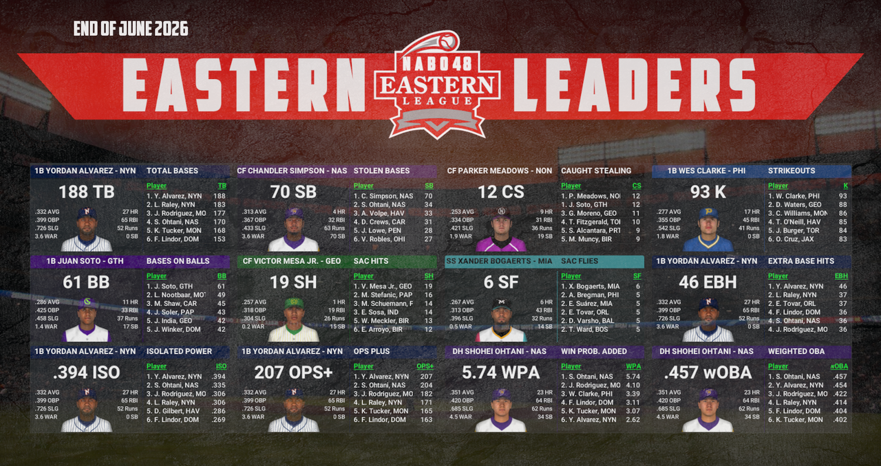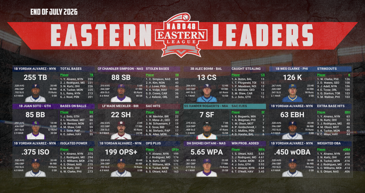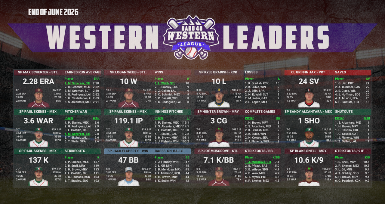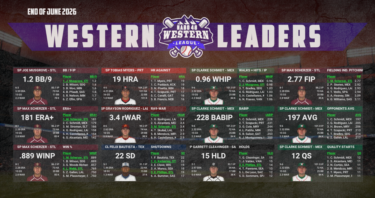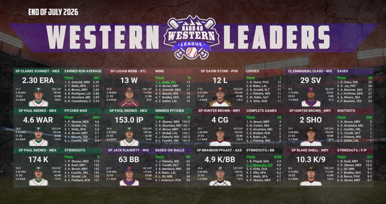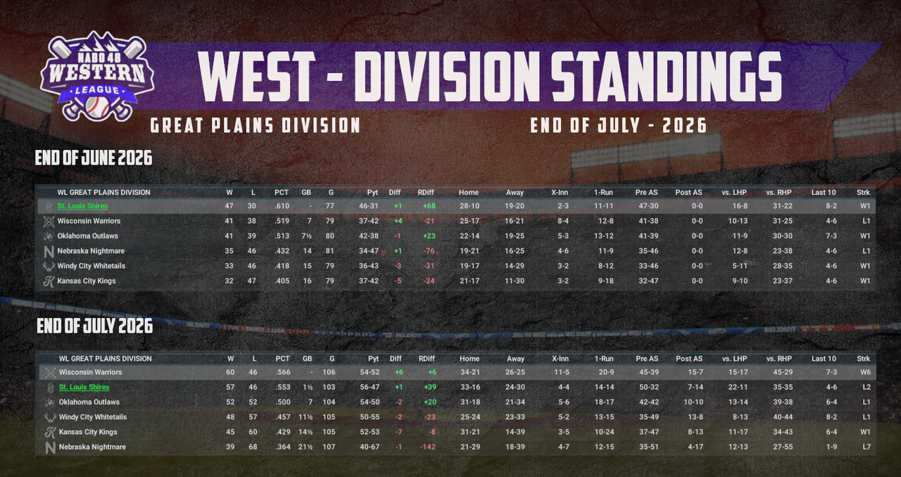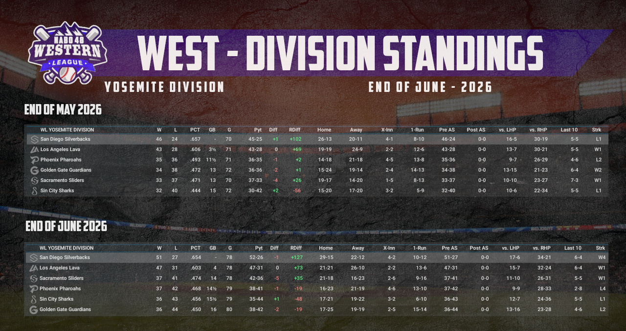 ![]() ![]() EAST - MVP RACE ----------------------------------- [1] Ju. Rodriguez MON - 10.5 [2] K. Tucker MON - 9.8 [3] S. Ohtani NAS - 9.8 [4] C. Williams MON - 8.6 [5] Y. Alvarez NYN - 8.6 [6] F. Lindor DOM - 8.5 [7] J. Soto GTHJ - 6.8 [8] M. Winn DCD - 6.7 [9] T. O'Neill HAV - 6.2 ![]() ![]() WEST - MVP RACE ------------------------------------ [1] B. Witt Jr WIN - 11.2 [2] R. Devers TEX - 8.1 [3] J. Merrill MRY - 7.0 [4] P. Crow-Armstrong PHX - 6.7 [5] M. Harris II SDG - 6.6 [6] C. Collier SAC - 6.6 [7] A. Riley SEA - 6.4 [8] E. Carter LAL - 5.7 [9] M. Yoshida WIS - 4.8 [10] C. Seager SIN - 4.7 |