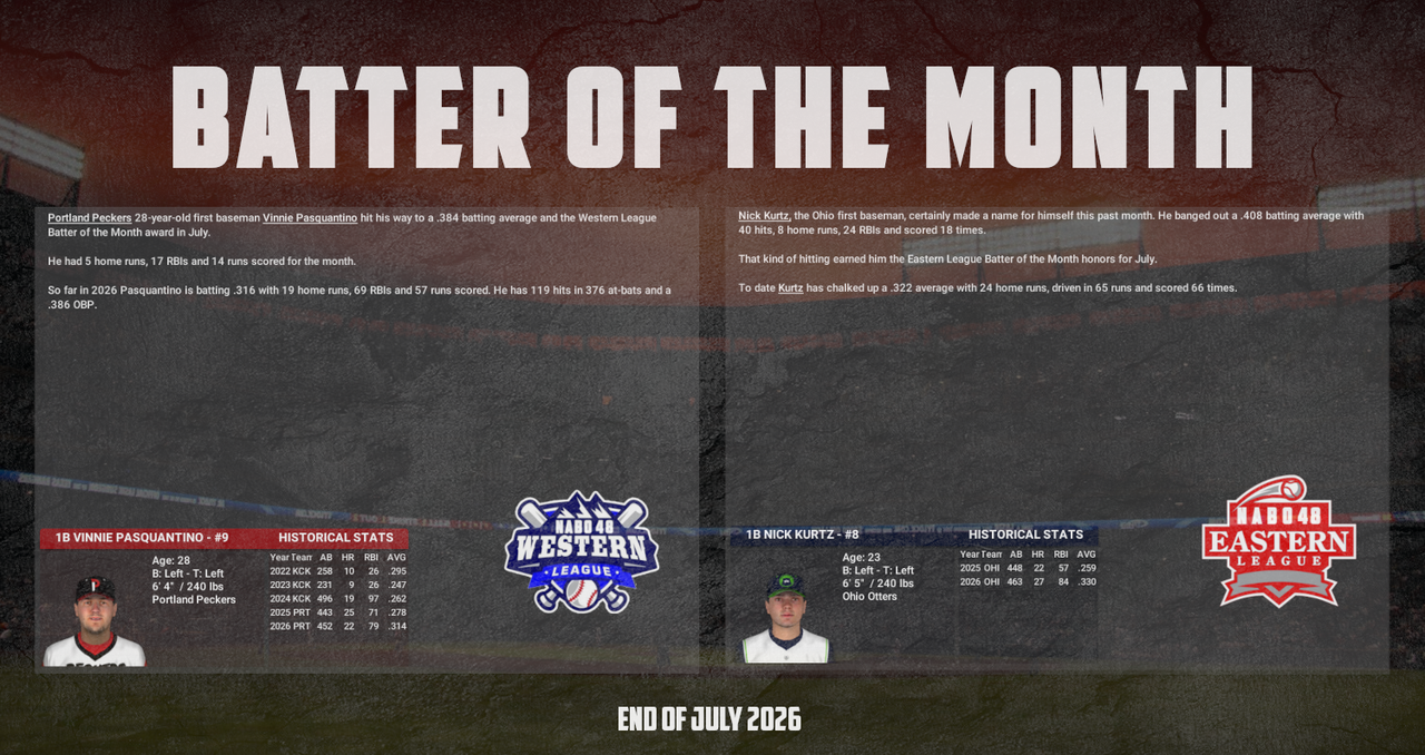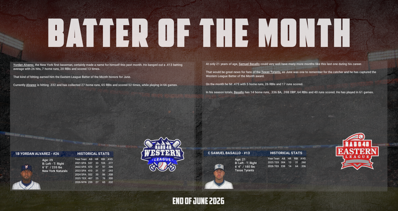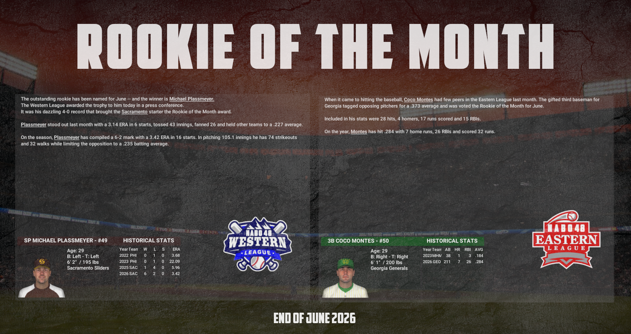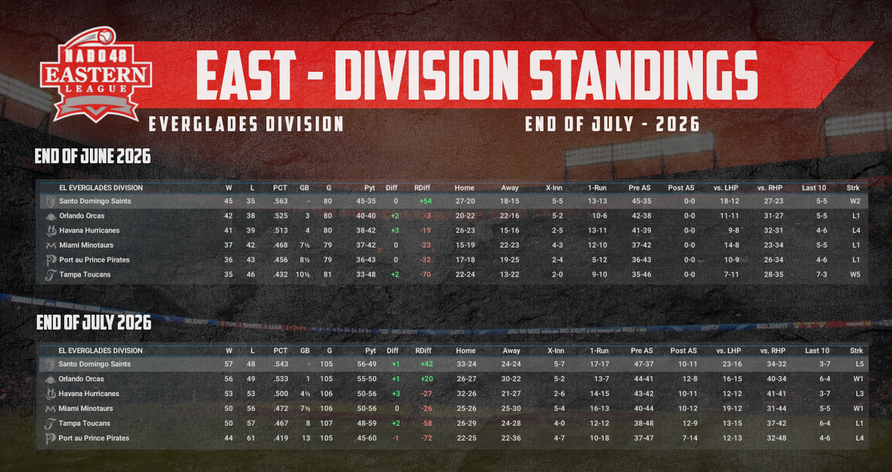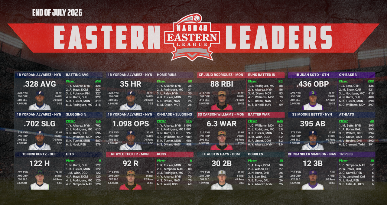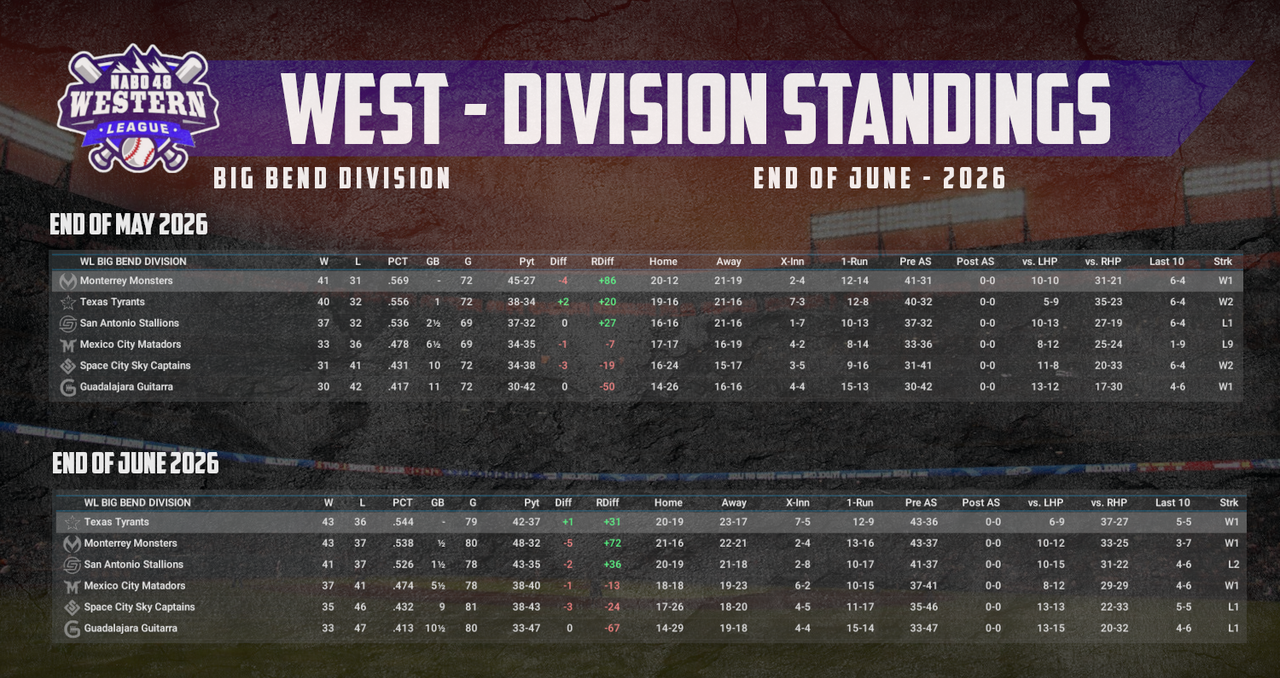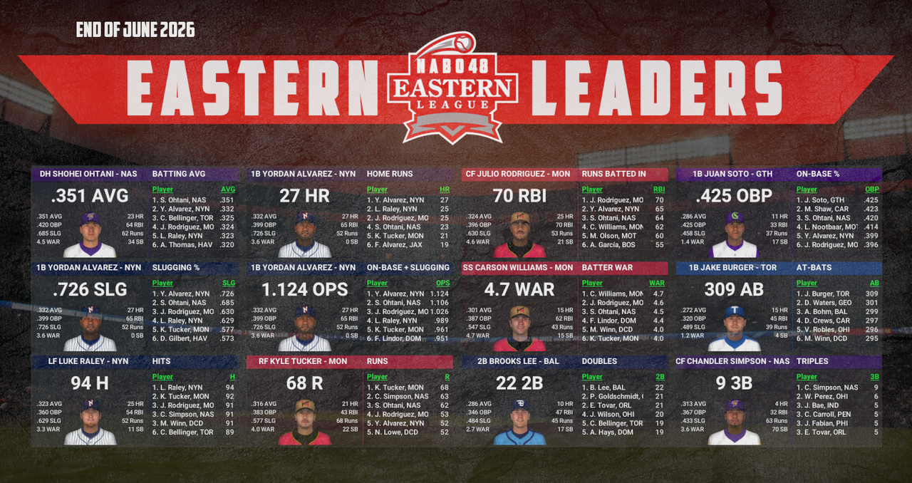 ![]() ![]() EAST - MVP RACE ----------------------------------- [1] Ju. Rodriguez MON - 10.5 [2] K. Tucker MON - 9.8 [3] S. Ohtani NAS - 9.8 [4] C. Williams MON - 8.6 [5] Y. Alvarez NYN - 8.6 [6] F. Lindor DOM - 8.5 [7] J. Soto GTHJ - 6.8 [8] M. Winn DCD - 6.7 [9] T. O'Neill HAV - 6.2 ![]() ![]() WEST - MVP RACE ------------------------------------ [1] B. Witt Jr WIN - 11.2 [2] R. Devers TEX - 8.1 [3] J. Merrill MRY - 7.0 [4] P. Crow-Armstrong PHX - 6.7 [5] M. Harris II SDG - 6.6 [6] C. Collier SAC - 6.6 [7] A. Riley SEA - 6.4 [8] E. Carter LAL - 5.7 [9] M. Yoshida WIS - 4.8 [10] C. Seager SIN - 4.7 |