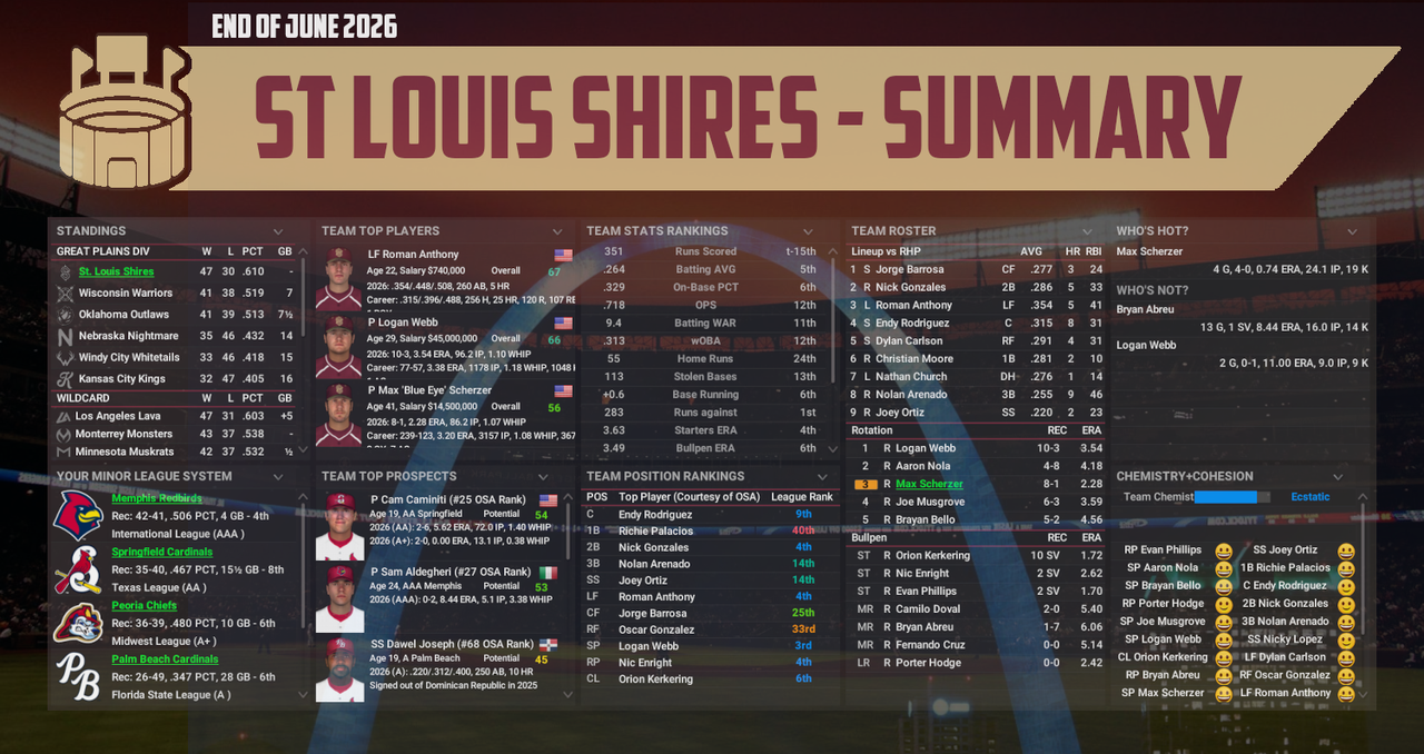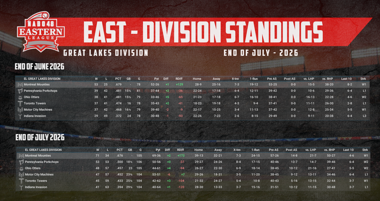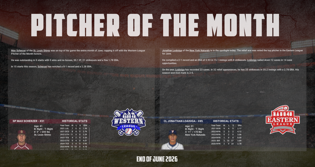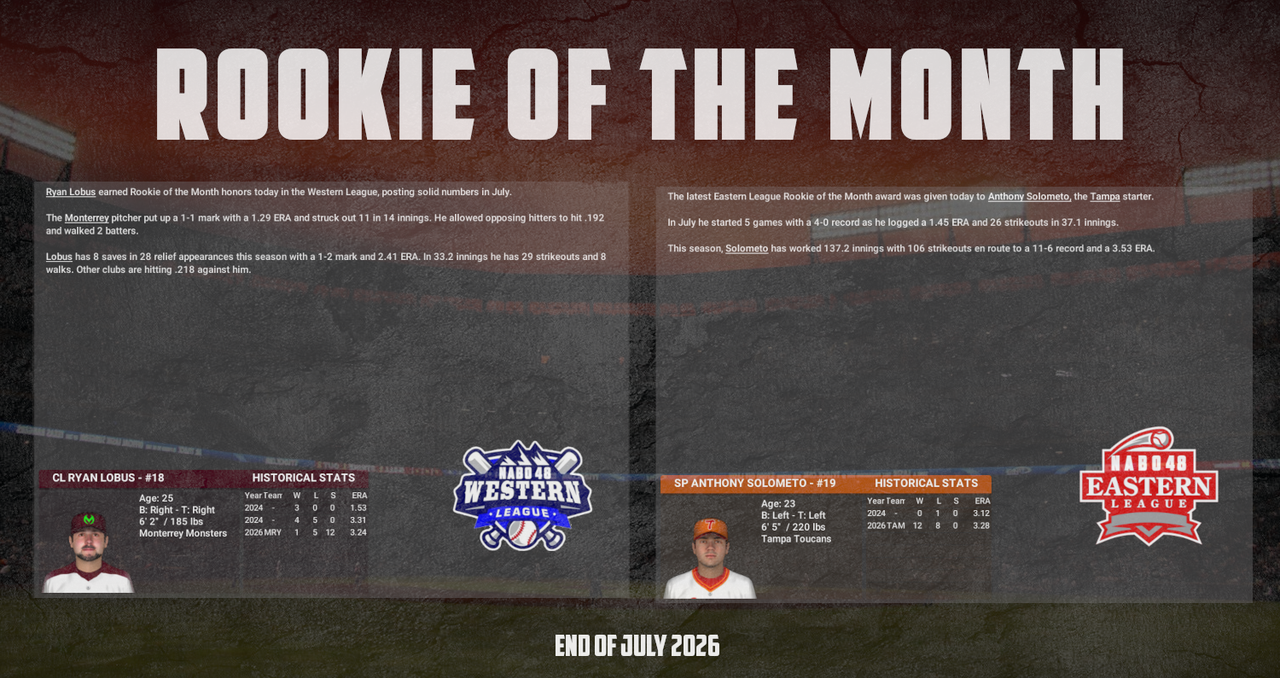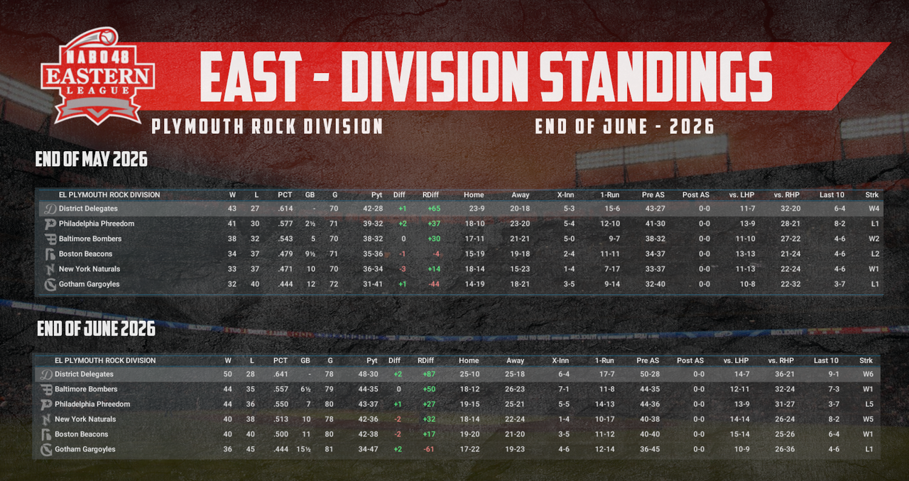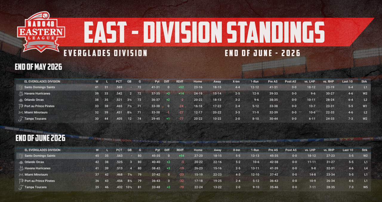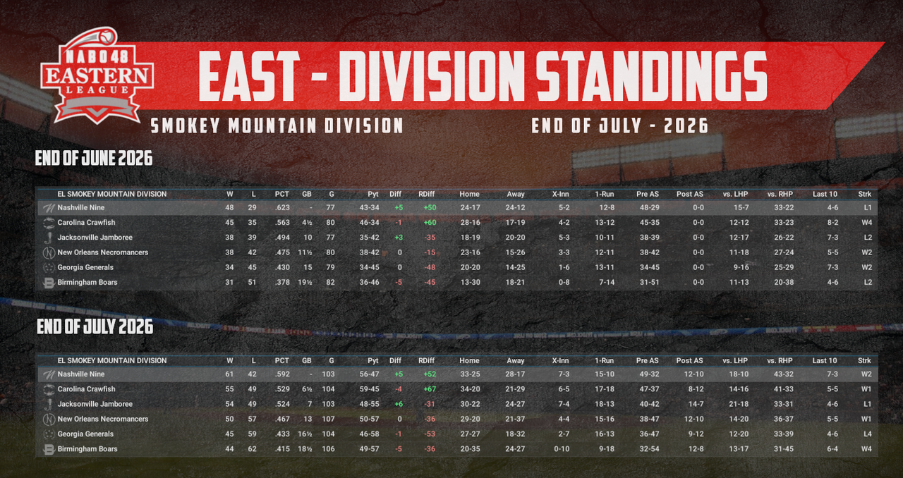 ![]() ![]() EAST - MVP RACE ----------------------------------- [1] Ju. Rodriguez MON - 10.5 [2] K. Tucker MON - 9.8 [3] S. Ohtani NAS - 9.8 [4] C. Williams MON - 8.6 [5] Y. Alvarez NYN - 8.6 [6] F. Lindor DOM - 8.5 [7] J. Soto GTHJ - 6.8 [8] M. Winn DCD - 6.7 [9] T. O'Neill HAV - 6.2 ![]() ![]() WEST - MVP RACE ------------------------------------ [1] B. Witt Jr WIN - 11.2 [2] R. Devers TEX - 8.1 [3] J. Merrill MRY - 7.0 [4] P. Crow-Armstrong PHX - 6.7 [5] M. Harris II SDG - 6.6 [6] C. Collier SAC - 6.6 [7] A. Riley SEA - 6.4 [8] E. Carter LAL - 5.7 [9] M. Yoshida WIS - 4.8 [10] C. Seager SIN - 4.7 |