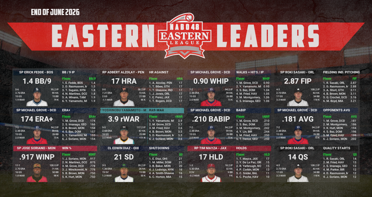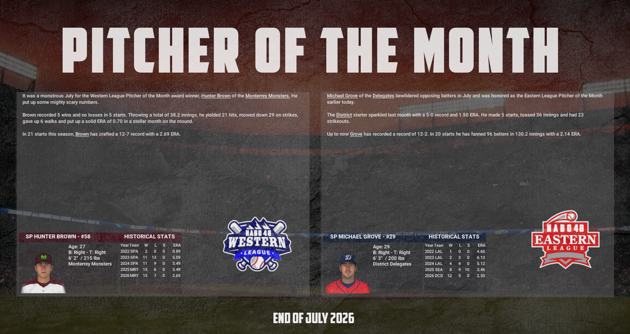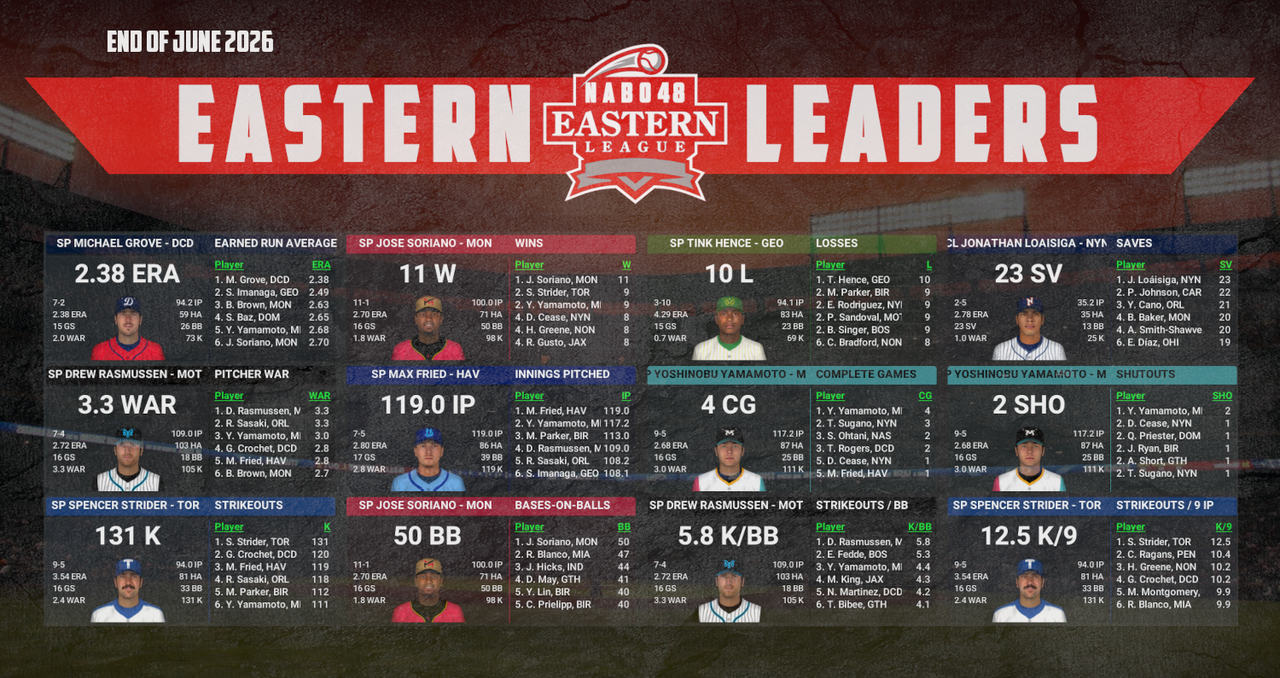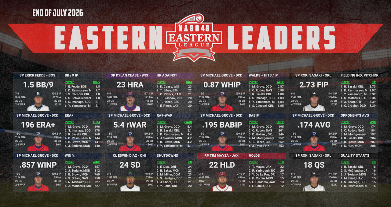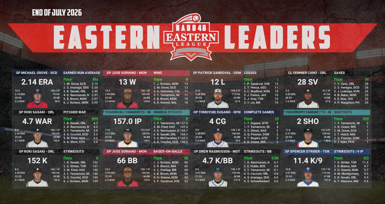 ![]() ![]() EAST - PITCHER OF THE YEAR RACE ------------------------------------------------------------- [1] R. Sasaki ORL - 9.8 [2] D. Rasmussen MOT - 8.7 [3] Y. Yamamoto MIA - 8.0 [4] M. Grove DCD - 8.0 [5] M. Fried HAV - 7.1 [6] J. Soriano MON - 7.1 [7] B. Brown MON - 7.1 [8] G. Crochet DCD - 6.1 [9] A. Short GTH - 5.3 Quote: