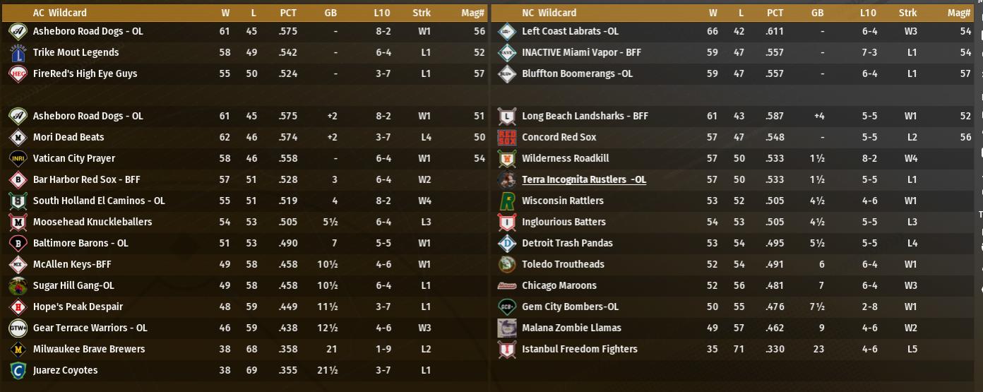 yeah, it'll be a stretch for the Syrups to steal this one.... if I calculated right, if Waffletown goes 10-0 in their final OL games, the Mad Brewers would need to go 4-6 in their last 10... and Waffletown is probably heading into a down month (21-6 in June, 11-15 in July, 18-8 in August....) but maybe they will surprise me... that solid month in August has pulled them within 4 games of Lemp for the division crown and within a half game of a wild card spot