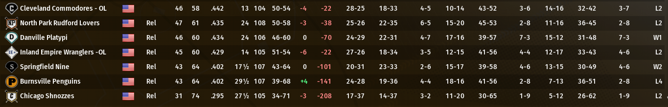 Playoff position for OL pretty strong right now, with five teams slotted for the postseason at the moment. Shoebox and Iron Maiden trying to avoid relegation. |