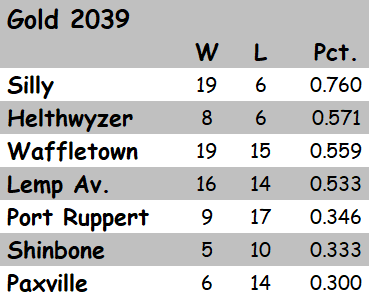 Looks like Silly are cruising, but there's the slimmest chance that Waffletown can catch them. Paxville had 12 1-run losses in a month, which I'm sure is a PT record for me. Depressing.