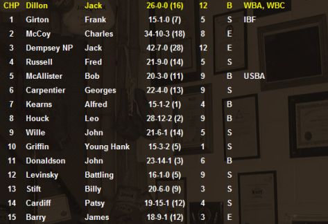 WBA - Jack Dillon (26-0) (3) WBC - Jack Dillon (26-0) (3) IBF - Jack Girton (15-1) (0) WBO - 65 fighters ranked (100 needed) Regional titles IBO - vacant (first title fight was a draw) AABU - Seamon Johnson (16-6) (3) USBA - Bob McAllister (20-3) (0) CBU - Billy McColl (18-13-1) (2) EBU - Only 3 fighters, need 4 for a title bout Undefeated fighters Jack Dillon (26-0) Tommy Gibbons (10-0) Larry Williams (7-0) Bob Sweeney (9-0) Harry Reeve (8-0) Posh Price (9-0) Frank Farmer (6-0-1) Joe Cavanaugh (6-0-2) 8 beginners |